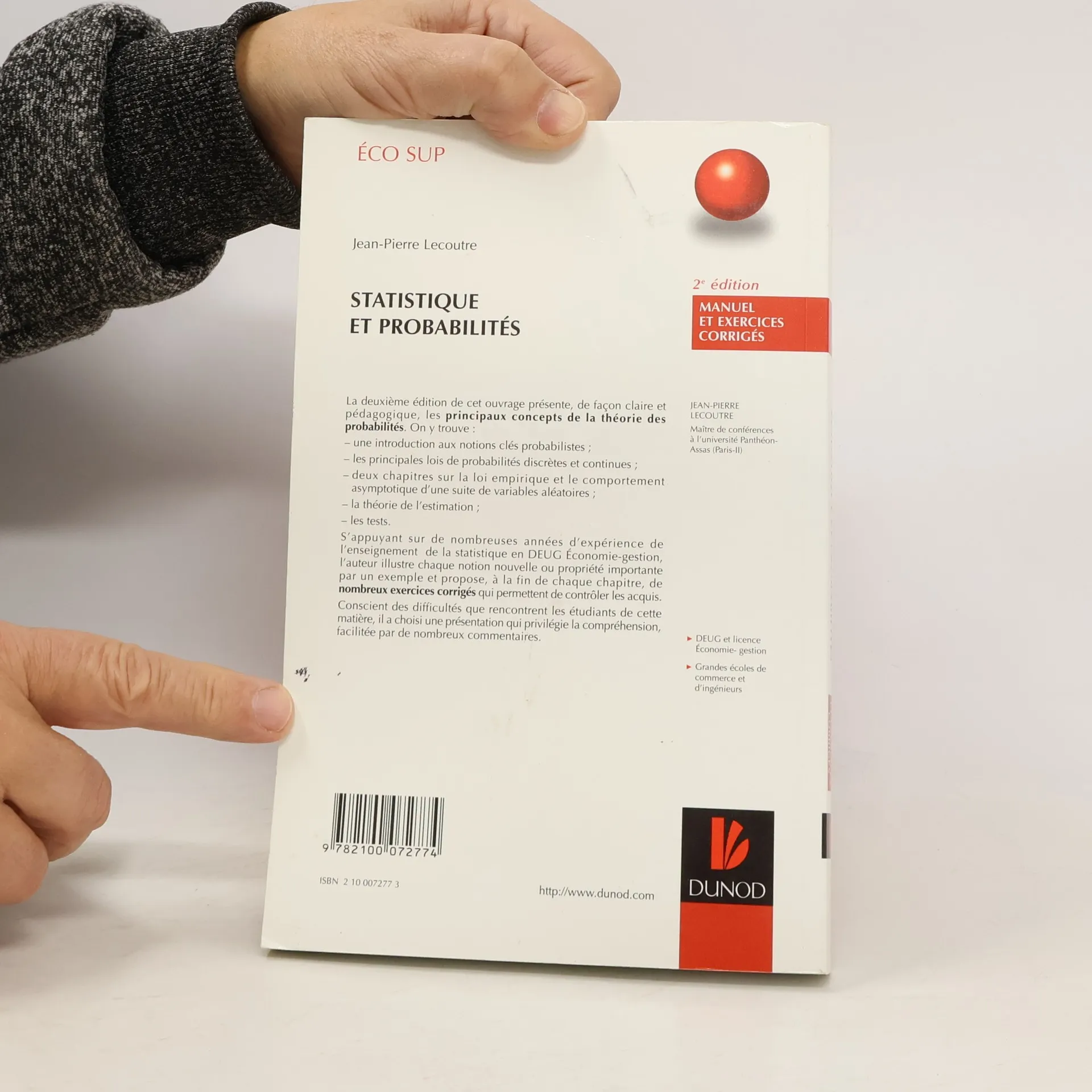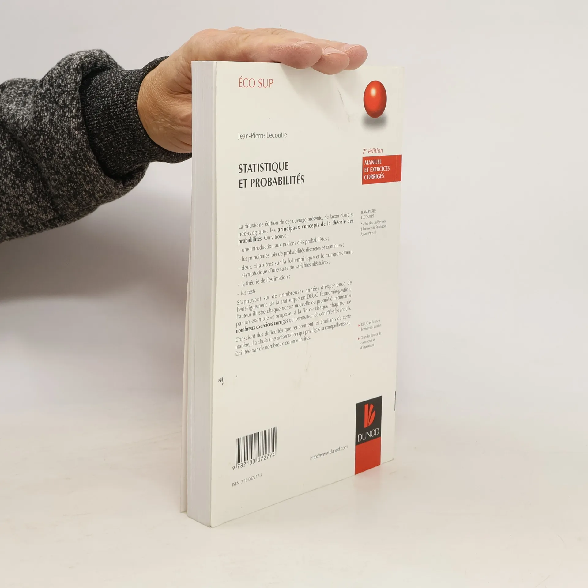 La deuxième édition de cet ouvrage présente, de façon claire et pédagogique, les principaux concepts de la théorie des probabilités. On y trouve une introduction aux notions clés probabilistes ; les principales lois de probabilités discrètes et continues ; deux chapitres sur la loi empirique et le comportement asymptotique d'une suite de variables aléatoires ; la théorie de l'estimation ; les tests. S'appuyant sur de nombreuses années d'expérience de l'enseignement de la statistique en DEUG Economie-gestion, l'auteur illustre chaque notion nouvelle ou propriété importante par un exemple et propose, à la fin de chaque chapitre, de nombreux exercices corrigés qui permettent de contrôler les acquis. Conscient des difficultés que rencontrent les étudiants de cette matière, il a choisi une présentation qui privilégie la compréhension, facilitée par de nombreux commentaires.