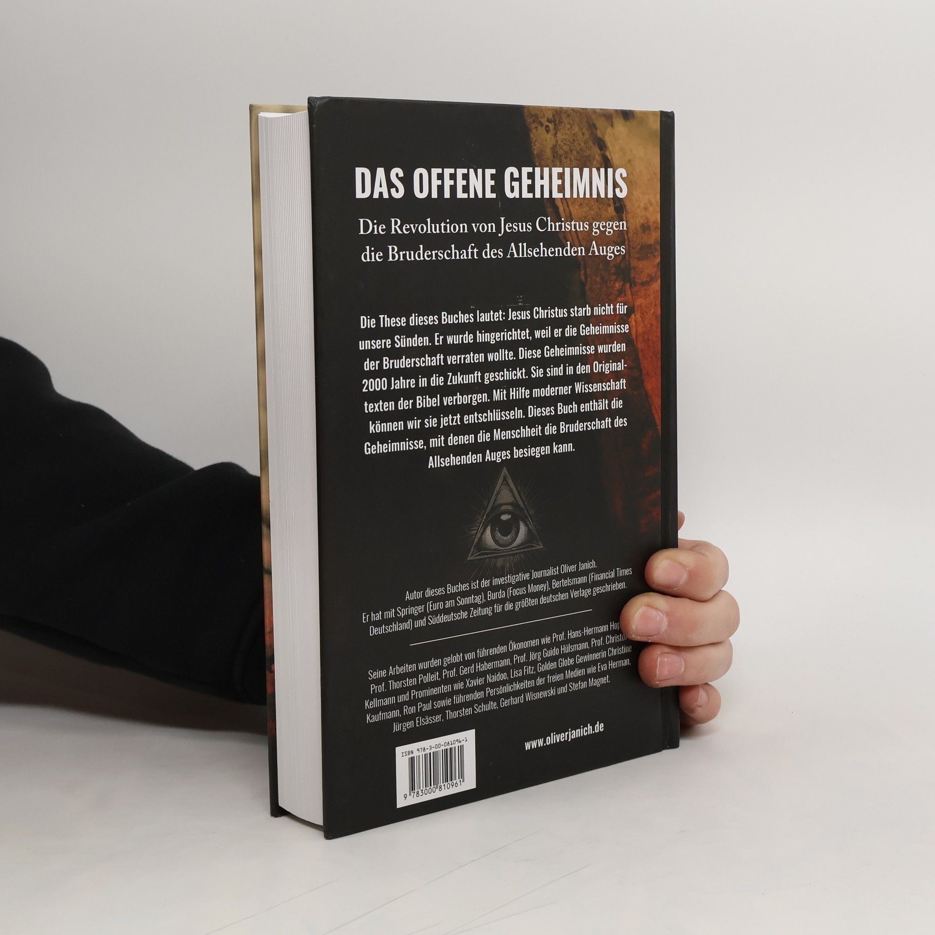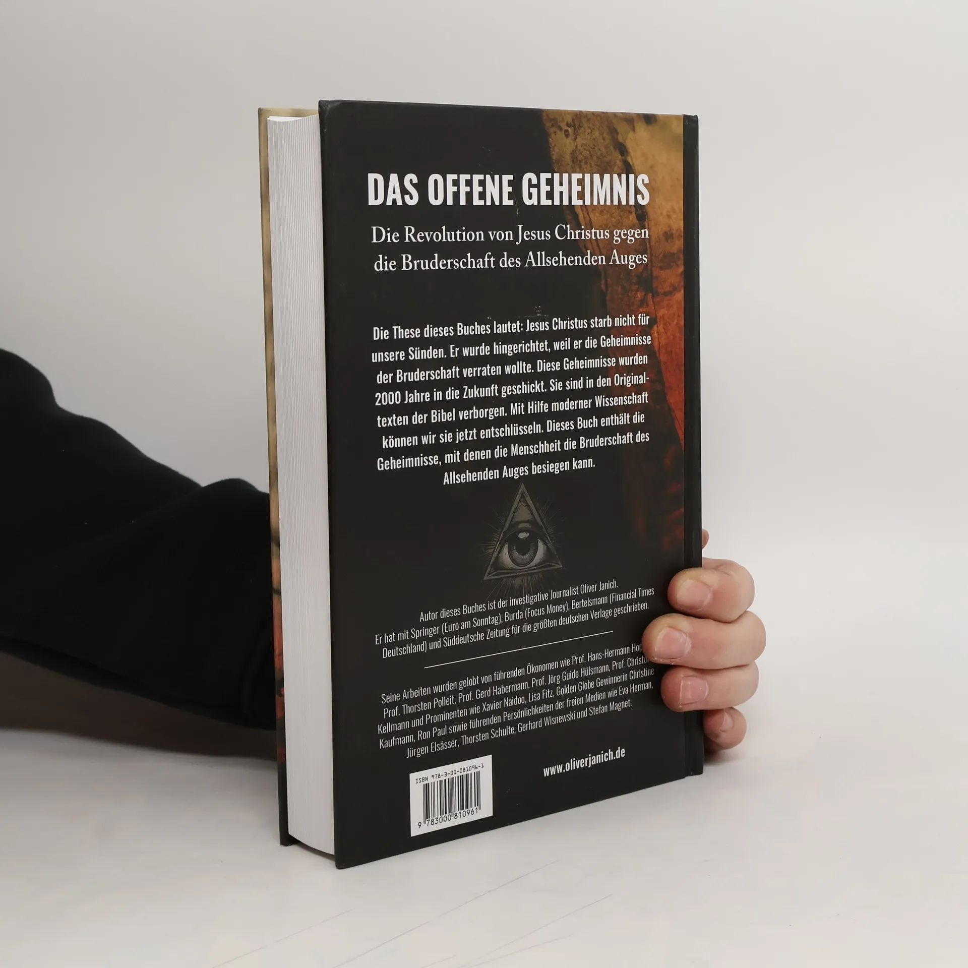 Die These dieses Buches lautet: Jesus Christus wurde hingerichtet, weil er gegen Geheimgesellschaften revoltiert hat, die laut Forschern wie Prof. Michael E. Stone zu seiner Zeit sehr aktiv waren. Diese Mysterien wurden durch die Originaltexte der Bibel 2000 Jahre in die Zukunft geschickt. Mit Hilfe moderner Wissenschaft können wir sie jetzt entschlüsseln. Die Nachfolger dieser Geheimgesellschaften sind die Freimaurer, deren Symbol, das Allsehende Auge, auf der Dollarnote verewigt ist. Dieses Buch enthält die Geheimnisse, mit denen die Menschheit diese Bruderschaft besiegen kann. Autor dieses Buches ist der investigative Journalist Oliver Janich. Er hat mit Springer (Euro am Sonntag), Burda (Focus Money), Bertelsmann (Financial Times Deutschland) und Süddeutsche Zeitung für die größten deutschen Verlage geschrieben. Seine Arbeiten wurden gelobt von führenden Ökonomen wie Prof. Hans-Hermann Hoppe, Prof. Thorsten Polleit, Prof. Gerd Habermann, Prof. Jörg Guido Hülsmann, Prof. Christof Kellmann und Prominenten wie Xavier Naidoo, Lisa Fitz, Golden Globe Gewinnerin Christine Kaufmann, Ron Paul sowie führenden Persönlichkeiten der freien Medien wie Eva Herman, Jürgen Elsässer, Thorsten Schulte, Gerhard Wisnewski und Stefan Magnet.
