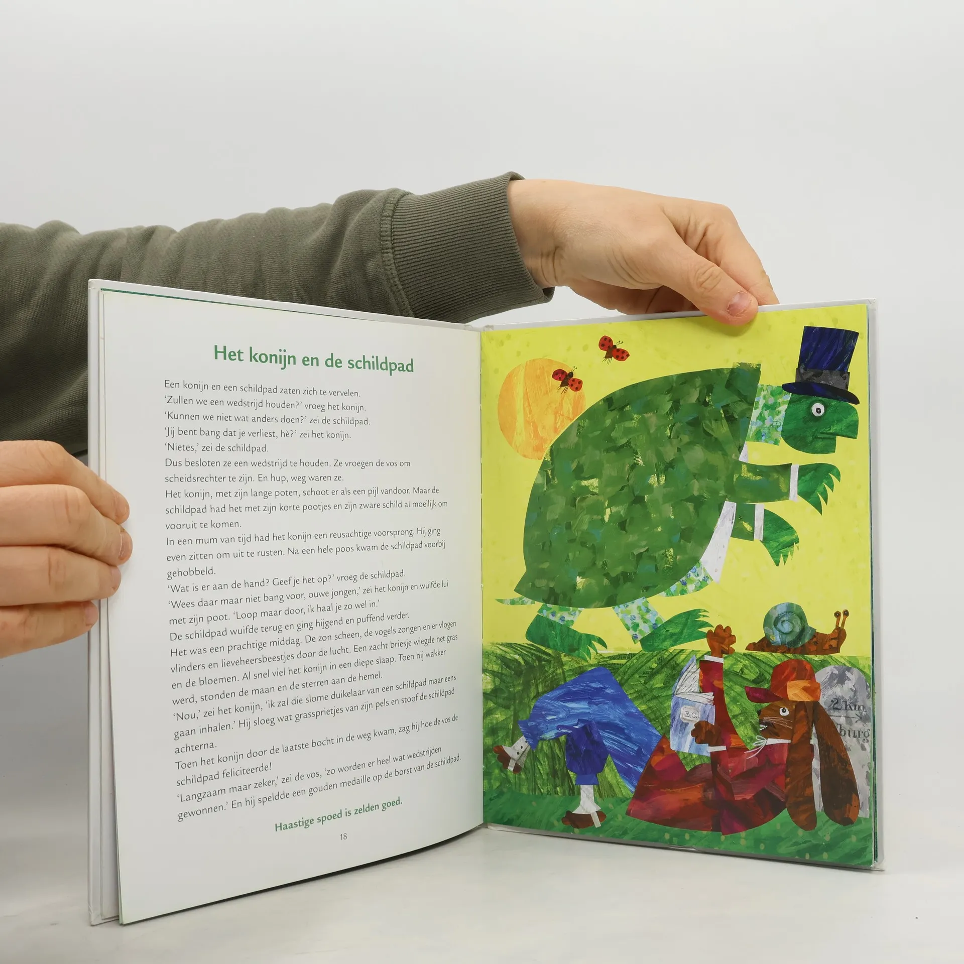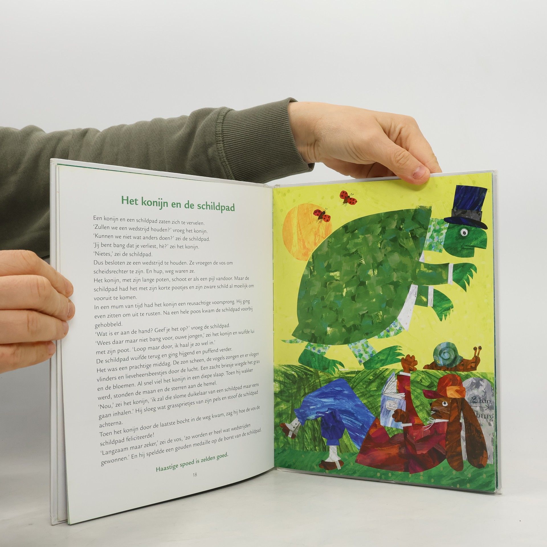 Prozabewerking van elf fabels van de Griekse dichter Aesopus (waarschijnlijk 6de eeuw vóór Chr.) aangevuld met kleurige, paginagrote illustraties in collagetechniek. Voorlezen vanaf ca. 5 jaar, zelf lezen vanaf ca. 8 jaar.