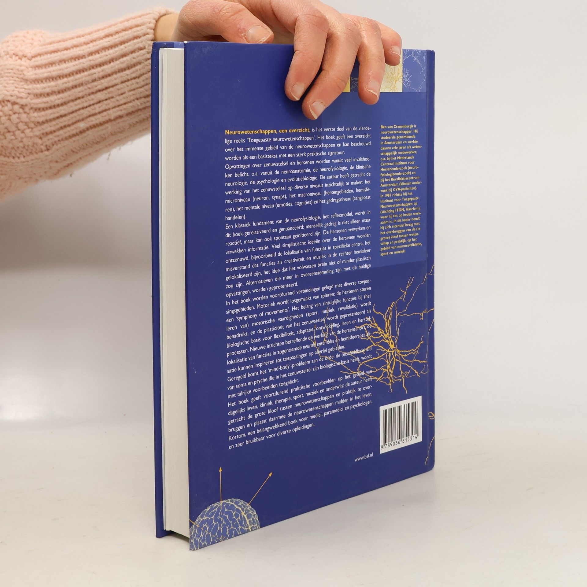 'Neurowetenschappen, een overzicht', is het eerste deel van de vierdelige reeks 'Toegepaste neurowetenschappen'. Het boek geeft een overzicht over het immense gebied van de neurowetenschappen en kan beschouwd worden als een basistekst met een sterk praktische signatuur. Opvattingen over zenuwstelsel en hersenen worden vanuit veel invalshoeken belicht, o.a. vanuit de neuroanatomie, de neurofysiologie, de klinische neurologie, de psychologie en evolutiebiologie. De auteur heeft getracht de werking van het zenuwstelsel op diverse niveaus inzichtelijk te maken: het microniveau (neuron, synaps), het macroniveau (hersengebieden, hemisferen), het mentale niveau (emoties, cognities) en het gedragsniveau (aangepast handelen). Een klassiek fundament van de neurofysiologie, het reflexmodel, wordt in dit boek gerelativeerd en genuanceerd: menselijk gedrag is niet alleen maar reactief, maar kan ook spontaan geinitieerd zijn. De hersenen verwerken en verwekken informatie. Veel simplistische ideeen over de hersenen worden ontzenuwd, bijvoorbeeld de lokalisatie van functies in specifieke centra, het misverstand dat functies als creativiteit en muziek in de rechter hemisfeer gelokaliseerd zijn, het idee dat het volwassen brein niet of minder plastisch zou zijn. Alternatieven die meer in overeenstemming zijn met de huidige opvattingen, worden gepresenteerd. In het boek worden voortdurend verbindingen gelegd met diverse toepassingsgebieden. Motoriek wordt losgemaakt van spieren: de hersenen sturen een 'symphony of movements'. Het belang van zintuiglijke functies bij (het leren van) motorische vaardigheden (sport, muziek, revalidatie) wordt benadrukt, en de plasticiteit van het zenuwstelsel wordt gepresenteerd als biologische basis voor flexibiliteit, adaptatie, ontwikkeling, leren en herstelprocessen. Nieuwe inzichten betreffende de werking van de hersenschors, de lokalisatie van functies in zogenoemde neurale ensembles en hemisfeerspecialisatie kunnen inspireren tot toepassingen op allerlei gebieden. Geregeld komt het 'mind-body'-probleem aan de orde: de onscheidbaarheid van soma en psyche die in het zenuwstelsel zijn biologische basis heeft, wordt met talrijke voorbeelden toegelicht. Het boek geeft voortdurend praktische voorbeelden op het gebied van dagelijks leven, kliniek, therapie, sport, muziek en onderwijs: de auteur heeft getracht de grote kloof tussen neurowetenschappen en praktijk te overbruggen en plaatst daarmee de neurowetenschappen midden in het leven. Kortom, een belangwekkend boek voor medici, paramedici en psychologen, en zeer bruikbaar voor diverse opleidingen. Nu met online verder studeren op StudieCloud door controlevragen en samenvattingen. Ben van Cranenburgh is neurowetenschapper. Hij studeerde geneeskunde in Amsterdam en werkte daarna vele jaren als wetenschappelijk medewerker o.a. bij het Nederlands Centraal Instituut voor Hersenonderzoek (neurofysiologieonderzoek) en bij het Revalidatiecentrum Amsterdam (klinisch onderzoek bij CVA-patienten). In 1987 richtte hij het Instituut voor Toegepaste Neurowetenschappen op (stichting ITON, Haarlem), waar hij tot op heden werkzaam is. In dit kader houdt hij zich intensief bezig met het overbruggen van de (te grote) kloof tussen wetenschap en praktijk, op het gebied van neurorevalidatie, sport en muziek. "