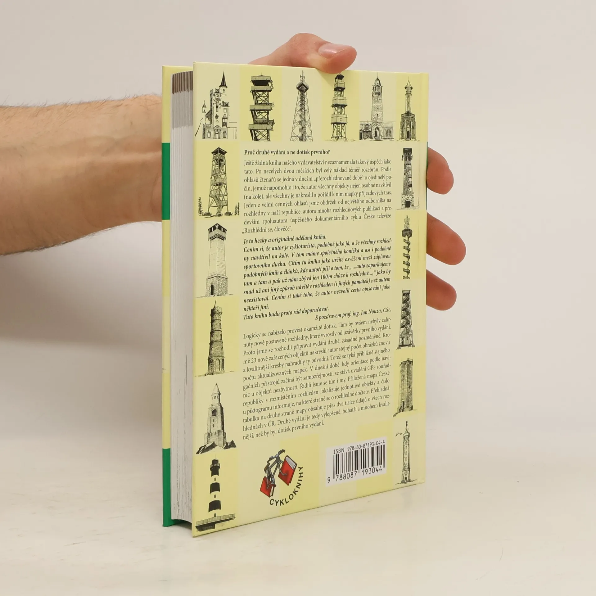 Proč druhé vydání a ne dotisk prvního? Tato kniha našeho vydavatelství zaznamenala bezprecedentní úspěch, přičemž celý náklad byl brzy rozebrán. Čtenáři ji vnímají jako ojedinělý počin v dnešní „přerozhlednované době“. Autor osobně navštívil a nakreslil všechny objekty, což přispělo k jejímu úspěchu. Původně se nabízelo provést dotisk, ale ten by nezahrnoval nově postavené rozhledny, které vznikly od uzávěrky prvního vydání. Proto jsme se rozhodli pro zásadně pozměněné druhé vydání. Obsahuje 23 nových objektů, přičemž autor znovu nakreslil stejný počet obrázků a kvalitnější kresby nahradily ty původní. Aktualizovány byly také mapky. V dnešní době, kdy je orientace podle navigačních přístrojů běžná, jsou GPS souřadnice nezbytností. Přiložená mapa České republiky lokalizuje jednotlivé objekty a číslo u piktogramu ukazuje, na které straně se o rozhledně dočtete. Tabulka na zadní straně mapy obsahuje přes dva tisíce údajů o všech rozhlednách v ČR. Druhé vydání je tedy bohatší a kvalitnější než dotisk prvního, ačkoliv si zachovává stejnou cenu.