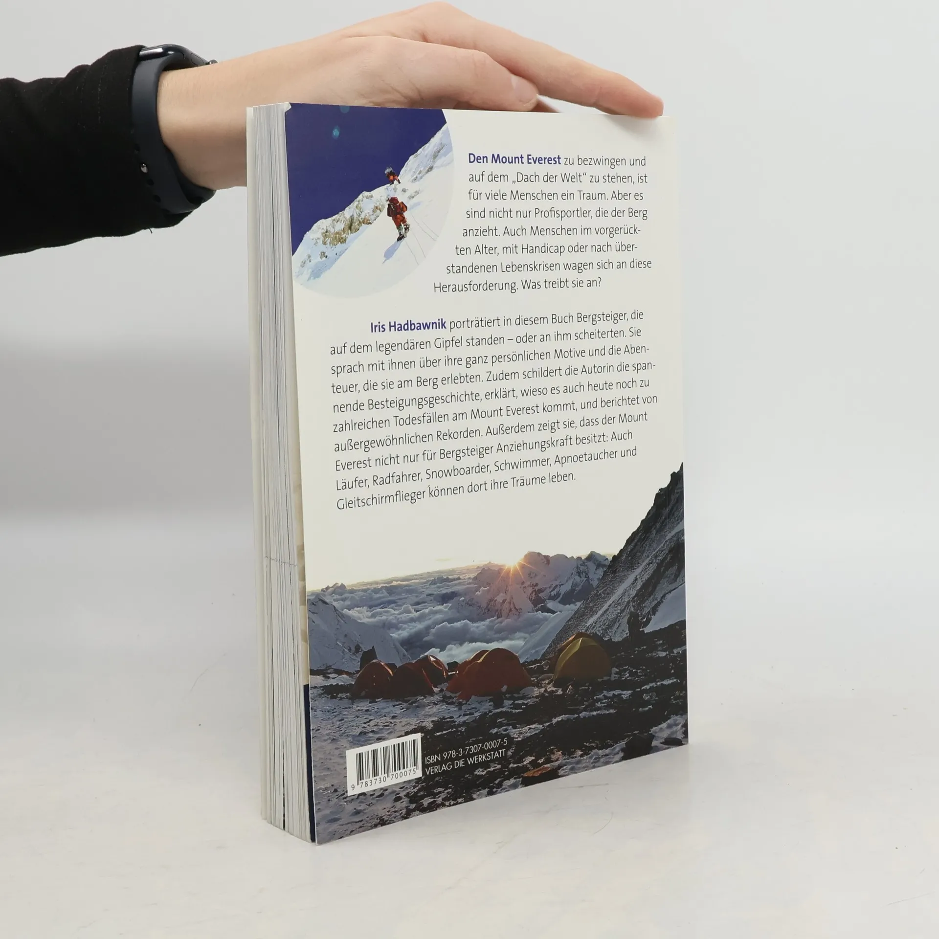 Den Mount Everest zu bezwingen und auf dem „Dach der Welt“ zu stehen, ist für viele Menschen ein Traum. Aber es sind nicht nur Profisportler, die der Berg anzieht. Auch Menschen im vorgerückten Alter, mit Handicap oder nach überstandenen Lebenskrisen wagen sich an diese Herausforderung. Was treibt sie an? Iris Hadbawnik porträtiert in diesem Buch Bergsteiger, die auf dem legendären Gipfel standen – oder an ihm scheiterten. Sie sprach mit ihnen über ihre ganz persönlichen Motive und die Abenteuer, die sie am Berg erlebten. Zudem schildert die Autorin die spannende Besteigungsgeschichte, erklärt, wieso es auch heute noch zu zahlreichen Todesfällen am Mount Everest kommt, und berichtet von außergewöhnlichen Rekorden. Außerdem zeigt sie, dass der Mount Everest nicht nur für Bergsteiger Anziehungskraft besitzt: Auch Läufer, Radfahrer, Snowboarder, Schwimmer, Apnoetaucher und Gleitschirmflieger können dort ihre Träume leben.