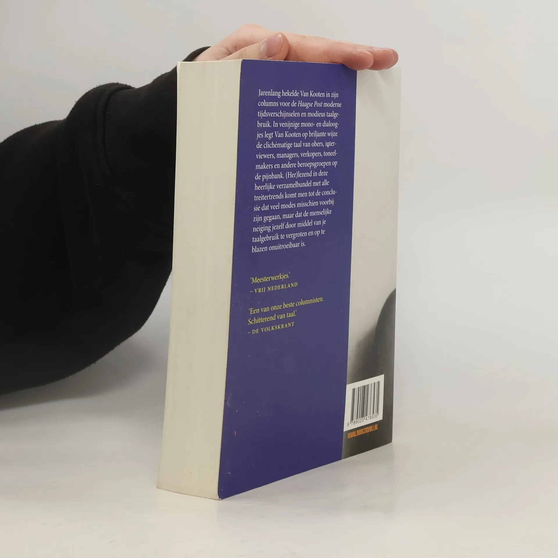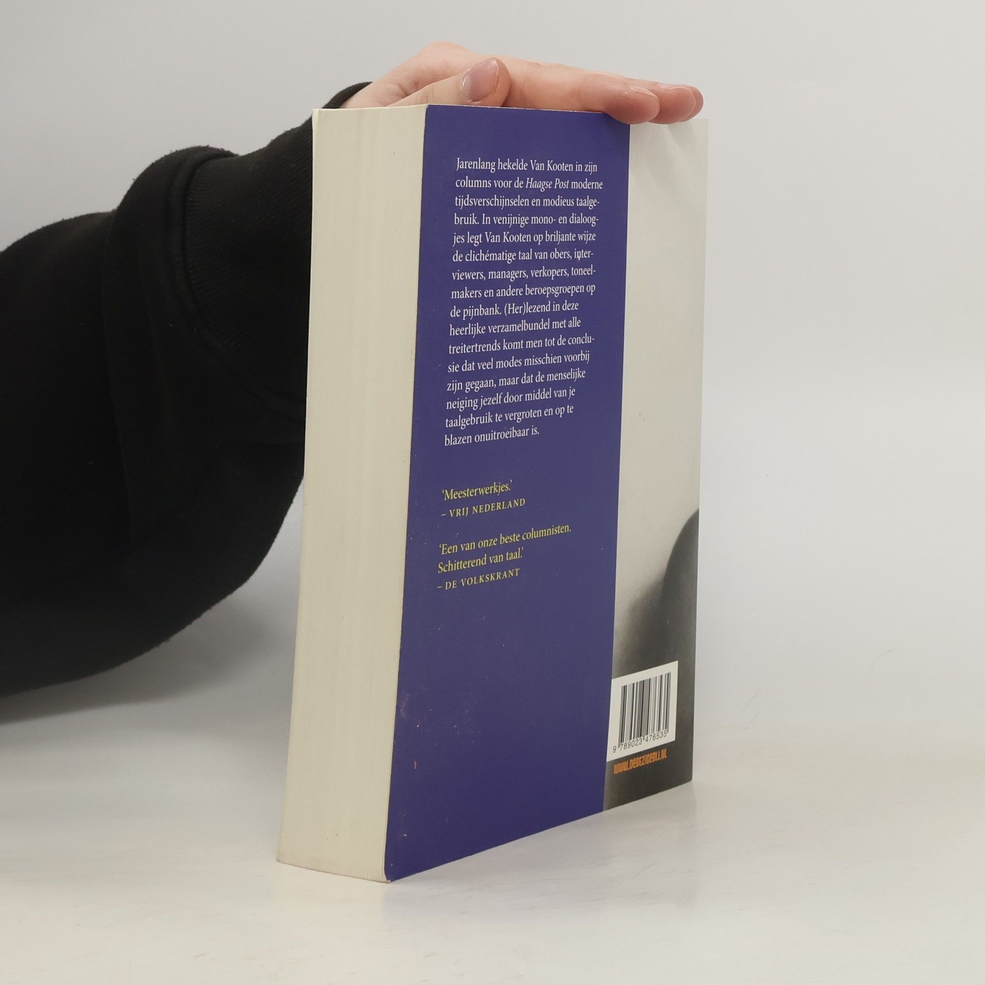 Jarenlang hekelde Van Kooten in zijn columns voor de Haagse Post moderne tijdsverschijnselen en modieus taalgebruik. In venijnige mono- en dialoogjes legt Van Kooten op briljante wijze de clichŽmatige taal van obers, interviewers, managers, verkopers, toneelmakers en andere beroepsgroepen op de pijnbank. (Her)lezend in deze heerlijke verzamelbundel met alle treitertrends komt men tot de conclusie dat veel modes misschien zijn voorbijgegaan, maar dat de menselijke neiging jezelf door middel van je taalgebruik te vergroten en op te blazen, onuitroeibaar is.