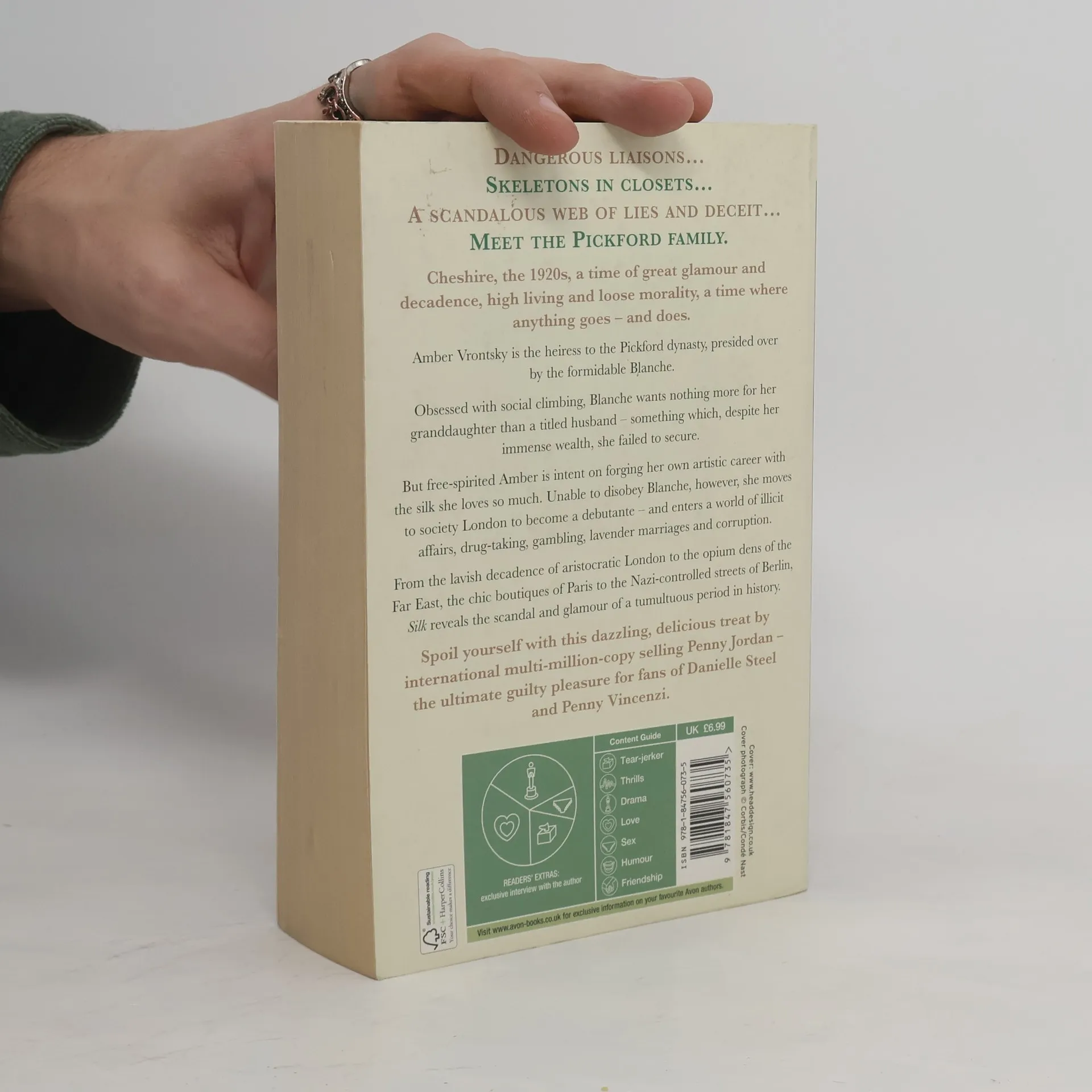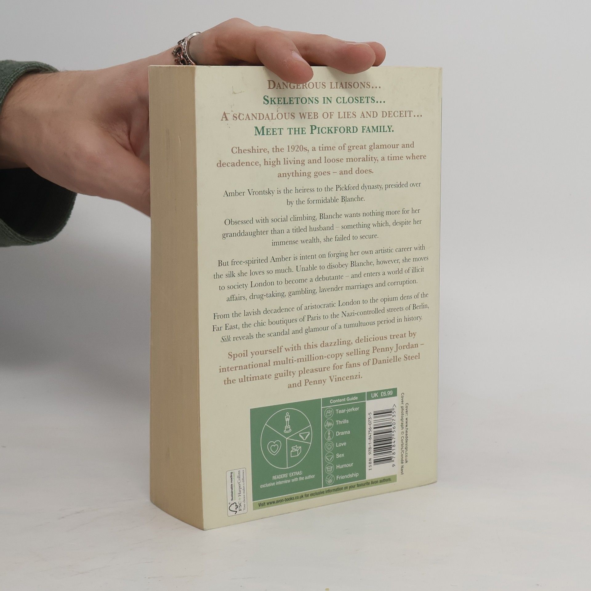 The first in a multi-generational trilogy by mega-seller Penny Jordan is set in the decadent world of the silk industry.Dangerous liaisons…Skeletons in closets…A scandalous web of lies and deceit…The Pickfords are just your average family.1920s Cheshire. A time of great glamour and decadence, high living and loose morality. A time where anything goes - and does.Amber Vrontsky is the heiress to the wealthy Pickford dynasty, presided over by the formidable Blanche.Obsessed with social climbing, Blanche wants nothing more for her granddaughter than a titled husband - a prize which she herself failed to secure, despite her immense wealth.But free spirited Amber is intent on forging her own artistic career with the silk she loves so much. Unable to disobey Blanche, however, she moves to society London to become a debutante - and enters a world of illicit affairs, drug-taking, gambling, lavender marriages…From the lavish decadence of society London to the opium dens of the Far East, the chic boutiques of Paris to the Nazi-controlled streets of Berlin, Silk spans the depravity and the glamour of this tumultuous time.Spoil yourself with this dazzling, decadent treat by international multi-million-copy selling Penny Jordan - the ultimate read for fans of Danielle Steel and Penny Vincenzi.