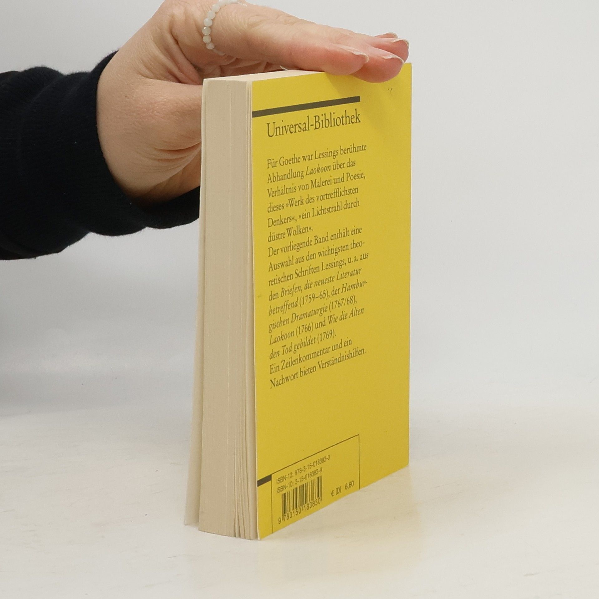 Der Band enthält eine Auswahl aus den wichtigsten theoretischen Schriften Gotthold Ephraim Lessings, unter anderem aus den 'Briefen, die neueste Literatur betreffend' (1759-1765), der 'Hamburgischen Dramaturgie' (1767/68), 'Laokoon' (1766) und 'Wie die Alten den Tod gebildet' (1769). Die Textgrundlage bildet die dritte Auflage der von Karl Lachmann und Franz Muncker herausgegebenen Ausgabe von Gotthold Ephraim Lessings 'Sämtlichen Schriften', wobei Orthographie und Interpunktion unverändert beibehalten wurden. Mit Kommentar, Literaturhinweisen und einem Nachwort von Albert Meier unter Mitarbeit von Maike Schmidt.