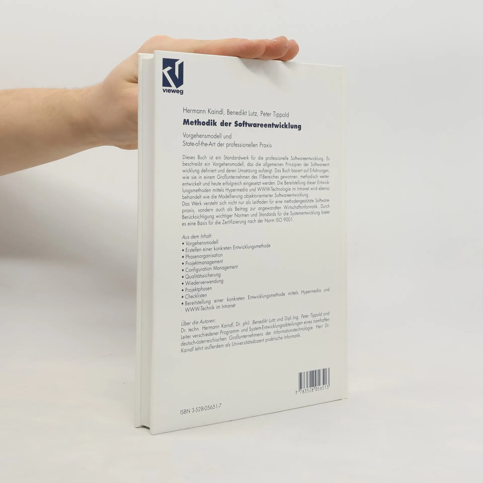 Dieses Buch ist ein Standardwerk für die professionelle Softwareentwicklung. Es beschreibt ein Vorgehensmodell, das die allgemeinen Prinzipien der Softwareentwicklung definiert und deren Umsetzung aufzeigt. Das Buch basiert auf Erfahrungen, wie sie in einem Großunternehmen des IT-Bereiches gewonnen, methodisch weiterentwickelt und heute erfolgreich eingesetzt werden. Die Bereitstellung dieser Entwicklungsmethoden mittels Hypermedia und WWW-Technologie im Intranet wird ebenso behandelt wie die Modellierung objektorientierter Softwareentwicklung. Das Werk versteht sich nicht nur als Leitfaden für eine methodengestützte Softwarepraxis, sondern auch als Beitrag zur angewandten Wirtschaftsinformatik. Durch Berücksichtigung wichtiger Normen und Standards für die Systementwicklung bietet es eine Basis für die Zertifizierung nach der Norm ISO 9001.