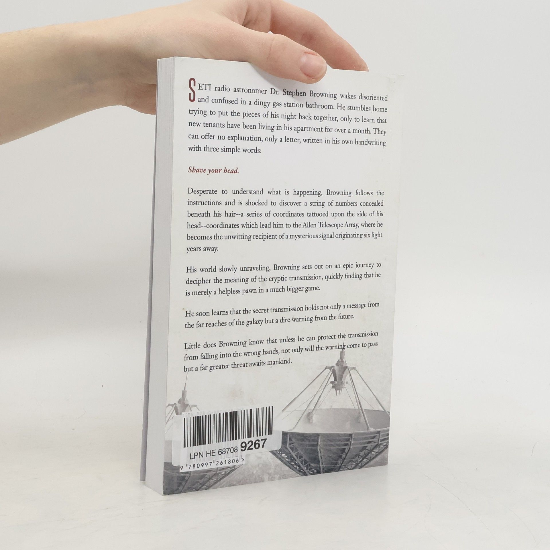 SETI radio astronomer Dr. Stephen Browning wakes disoriented and confused in a dingy gas station bathroom. He stumbles home trying to put the pieces of his night back together, only to discover that there are new tenants living inside his apartment when he arrives. This leads him to a shocking realization – over a month has passed since his last recollection. Oddly, these new tenants provide him with one clue, a letter - written in his own handwriting - instructing him what to do next: Shave your head. Eager to uncover the reason for his memory lapse, Browning complies and finds a string of coordinates tattooed onto the side of his head, which inevitably lead him to the discovery of a cryptic signal from far outside our solar system. Enlisting the help of a wealthy Silicon Valley engineer and a brilliant NASA robotics programmer, Dr. Browning begins a journey to decipher the meaning of the transmission, only to find he has become an unwitting pawn in a much bigger game. Soon it becomes apparent that the transmission is not only a message from the farthest reaches of the galaxy, but a warning from the future. Unless Browning and his team can protect the information from falling into the wrong hands, its message – and its warning – will be lost forever.