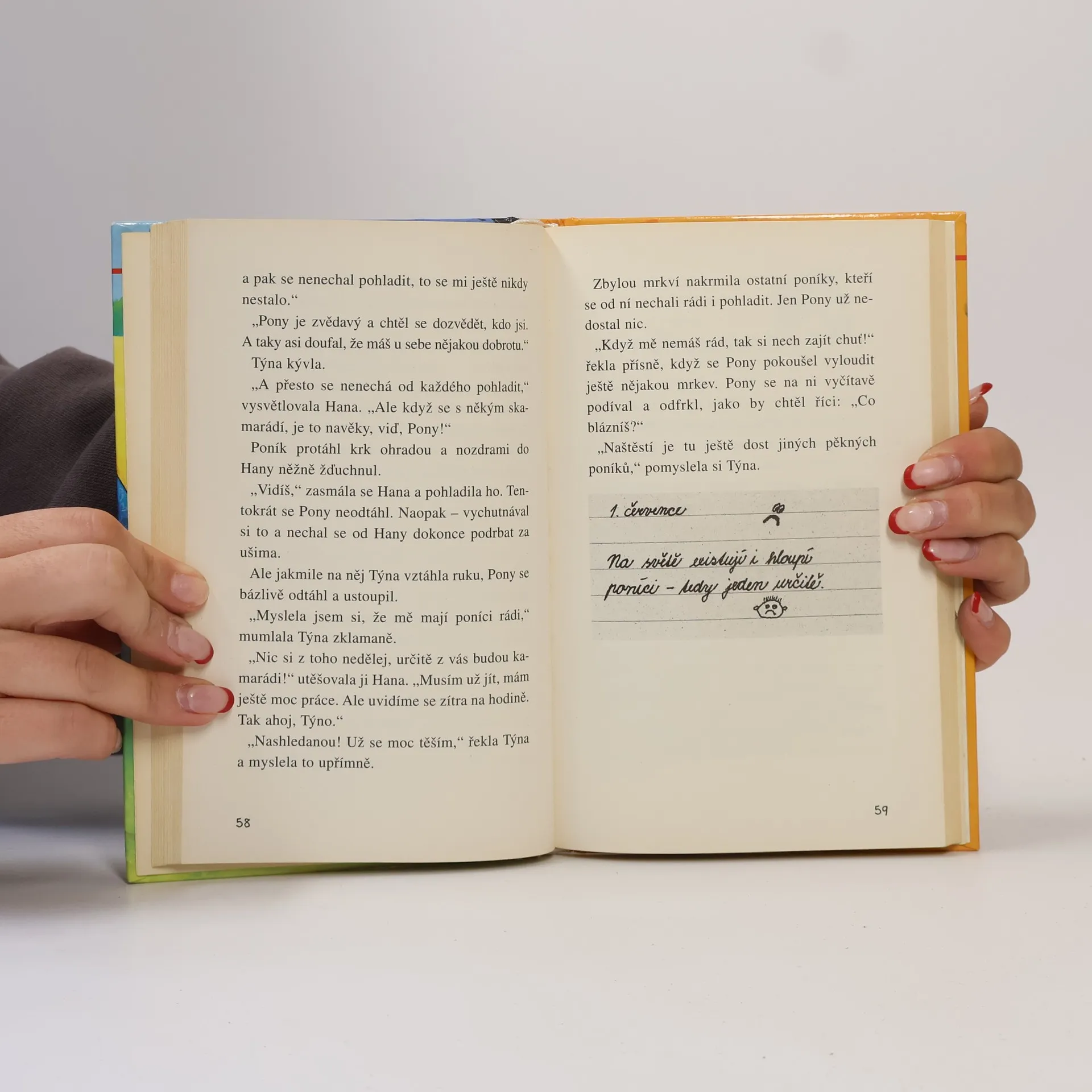 Příběh devítileté Týny o její lásce k poníkům. Kniha je určena dětem (převážně dívkám) mladšího školního věku. Valentýna se s rodiči přestěhovala z Prahy do Hradiště, kde maminka dostala práci v místním safari. Týna hrozně ráda jezdí na ponících a tak uvítala, že má jízdárnu hned za domem. Celé prázdniny chodila do jízdárny, kde si oblíbila poníka Ponyho. Jednoho dne se však stala ošklivá nehoda, Ponyho srazilo auto.