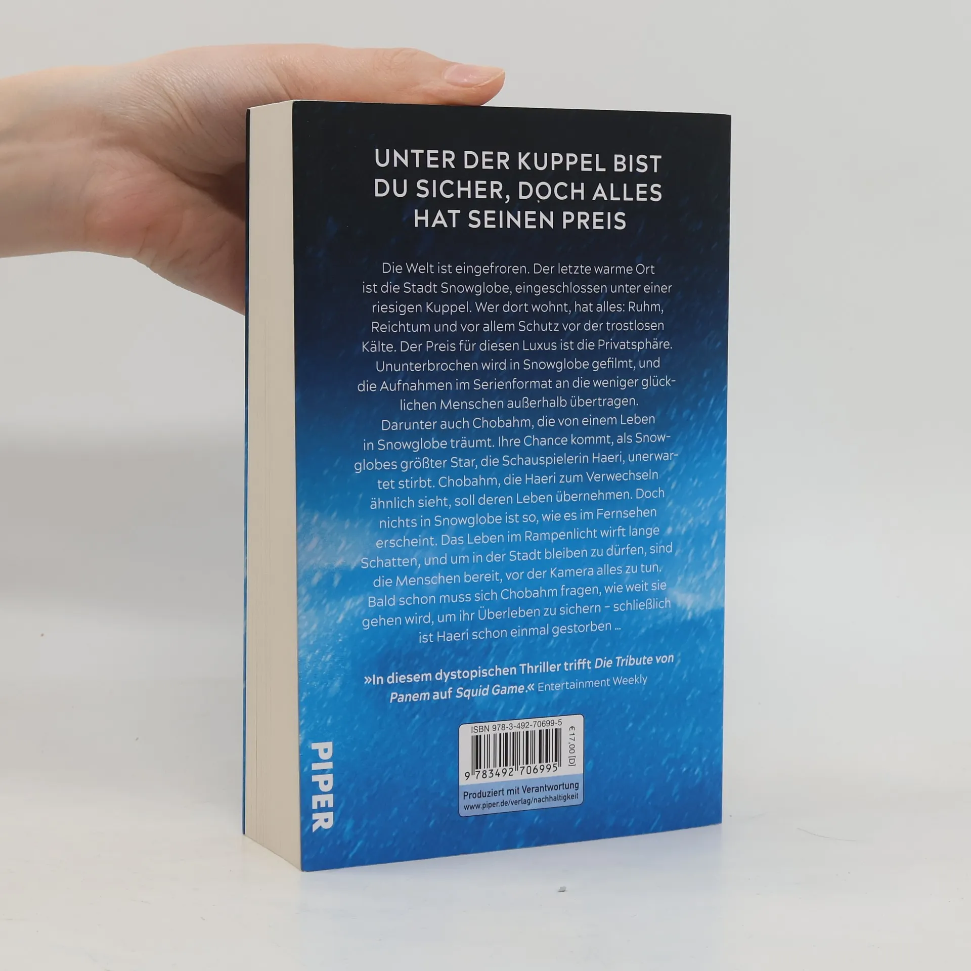 Draußen ist es bitterkalt. Drinnen wirst du immer beobachtet. Die Welt ist eingefroren. Nur die Stadt Snowglobe, eingeschlossen unter einer riesigen Kuppel, bietet noch ein komfortables Leben. Doch wer dort wohnt, bezahlt mit seiner Privatsphäre: Konstant wird ihr Leben für die weniger glücklichen Menschen außerhalb gefilmt. Die junge Chobahm träumt davon, eines Tages selbst in Snowglobe zu leben. Ihre Chance kommt, als eine der Schauspielerinnen unerwartet stirbt und Chobahm deren Platz und Leben einnehmen soll. Doch ihre neue Rolle im Rampenlicht wirft lange Schatten – und garantiert noch lange nicht Chobahms Überleben …