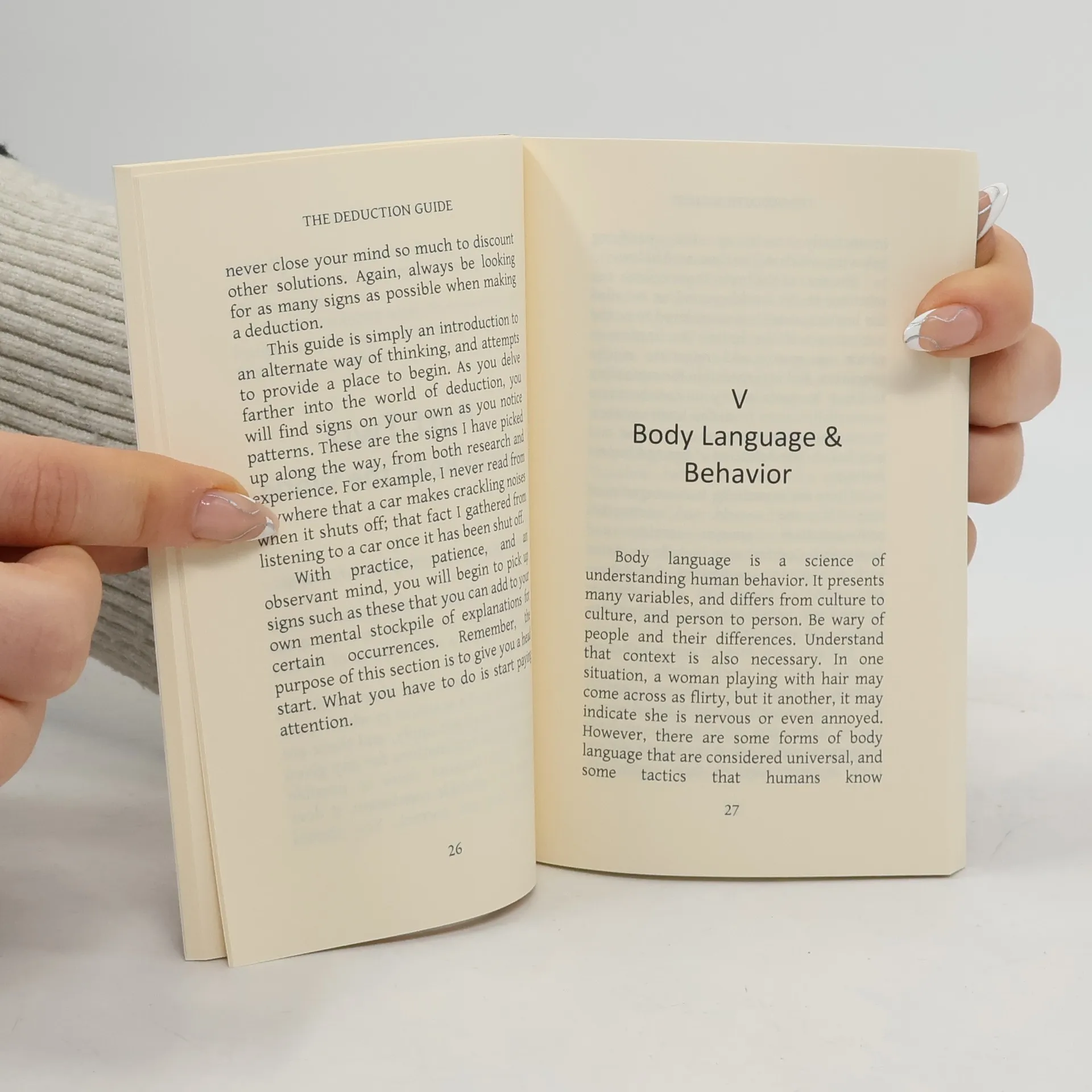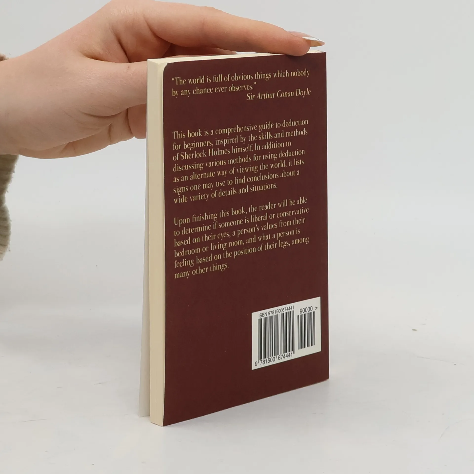 Want to be a little bit more like Sherlock Holmes? The Deduction Guide will provide you with an alternate way of perceiving your surroundings, and allow you begin to make deductions about people and objects. The majority of the book is devoted to ways to read the world, including examples in a wide variety of topics, such as body language, clothing and other belongings, in the spirit of Sherlock Holmes. Upon reading this book, you will be able to identify if someone is liberal or conservative based on their eyes, a person’s values from their bedroom or living room, and what a person is feeling based on the position of their legs, among many other things. Stay in tune for the release of the second edition, which will go much more in depth and contain many more topics!
