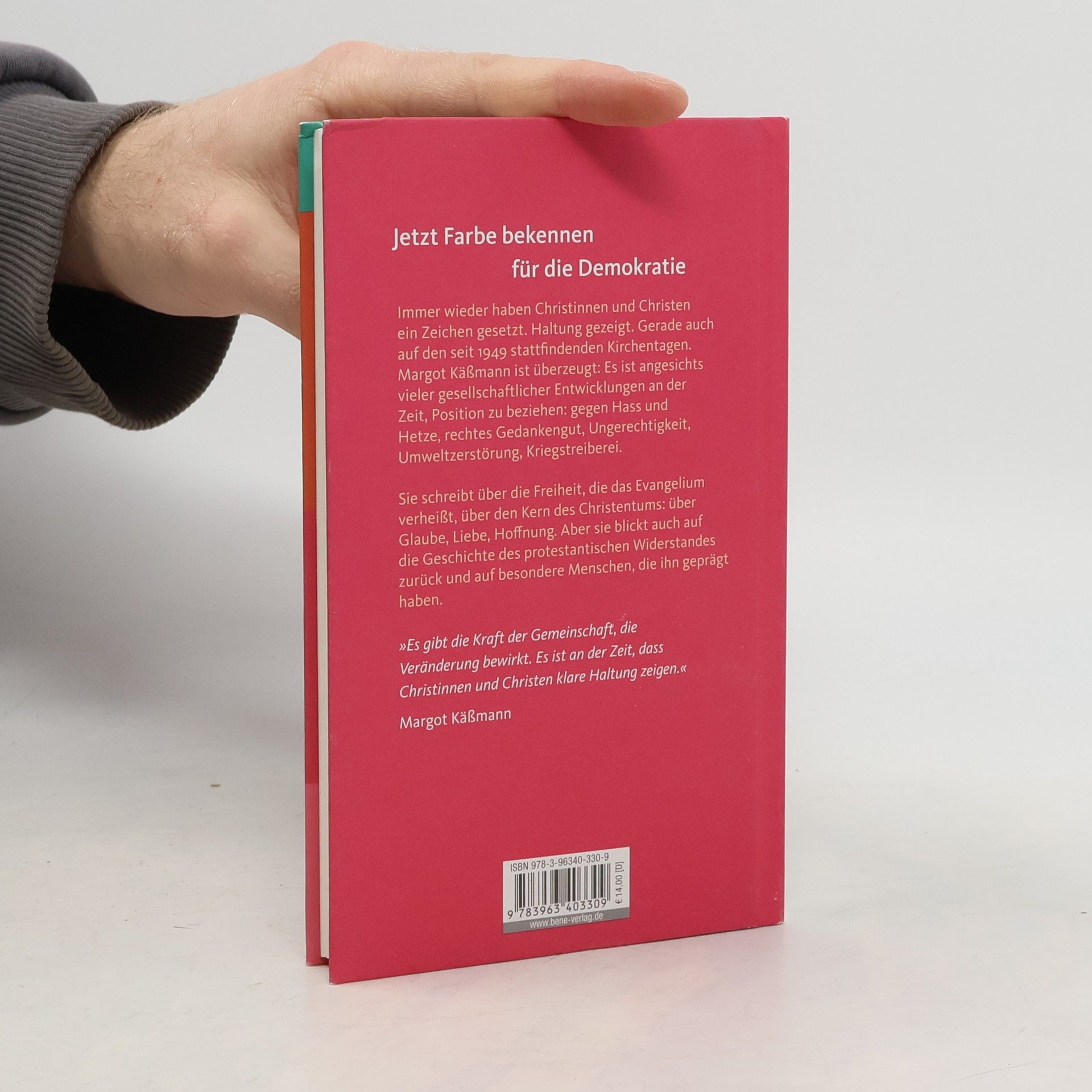Jetzt Farbe bekennen für die Demokratie Immer wieder haben Christinnen und Christen ein Zeichen gesetzt. Haltung gezeigt. Gerade auch auf den seit 1949 stattfindenden Kirchentagen. Margot Käßmann ist eine von ihnen und sagt: » Ja, es braucht auch heute Mut, Engagement und Herz, unser aller Einsatz für Demokratie und Menschlichkeit. « Ein Buch, das all denen Mut macht, die sich nach einem stärkeren Miteinander sehnen. »Es gibt die Kraft der Gemeinschaft, die Veränderung bewirkt. Es ist an der Zeit, dass Christinnen und Christen klare Haltung zeigen.« Margot Käßmann Die ehemalige hannoversche Landesbischöfin ist überzeugt: Es ist angesichts vieler gesellschaftlicher Entwicklungen an der Zeit, Position zu beziehen: gegen Hass und Hetze, rechtes Gedankengut, Ungerechtigkeit, Umweltzerstörung, Kriegstreiberei. Sie schreibt über die Freiheit, die das Evangelium verheißt, über den Kern des Christentums: über Glaube, Liebe, Hoffnung . Aber sie blickt auch auf die Geschichte des protestantischen Widerstandes und besondere Menschen zurück, die ihn geprägt haben. »Seid mutig und stark« ist eine Einladung, Haltung zu zeigen.