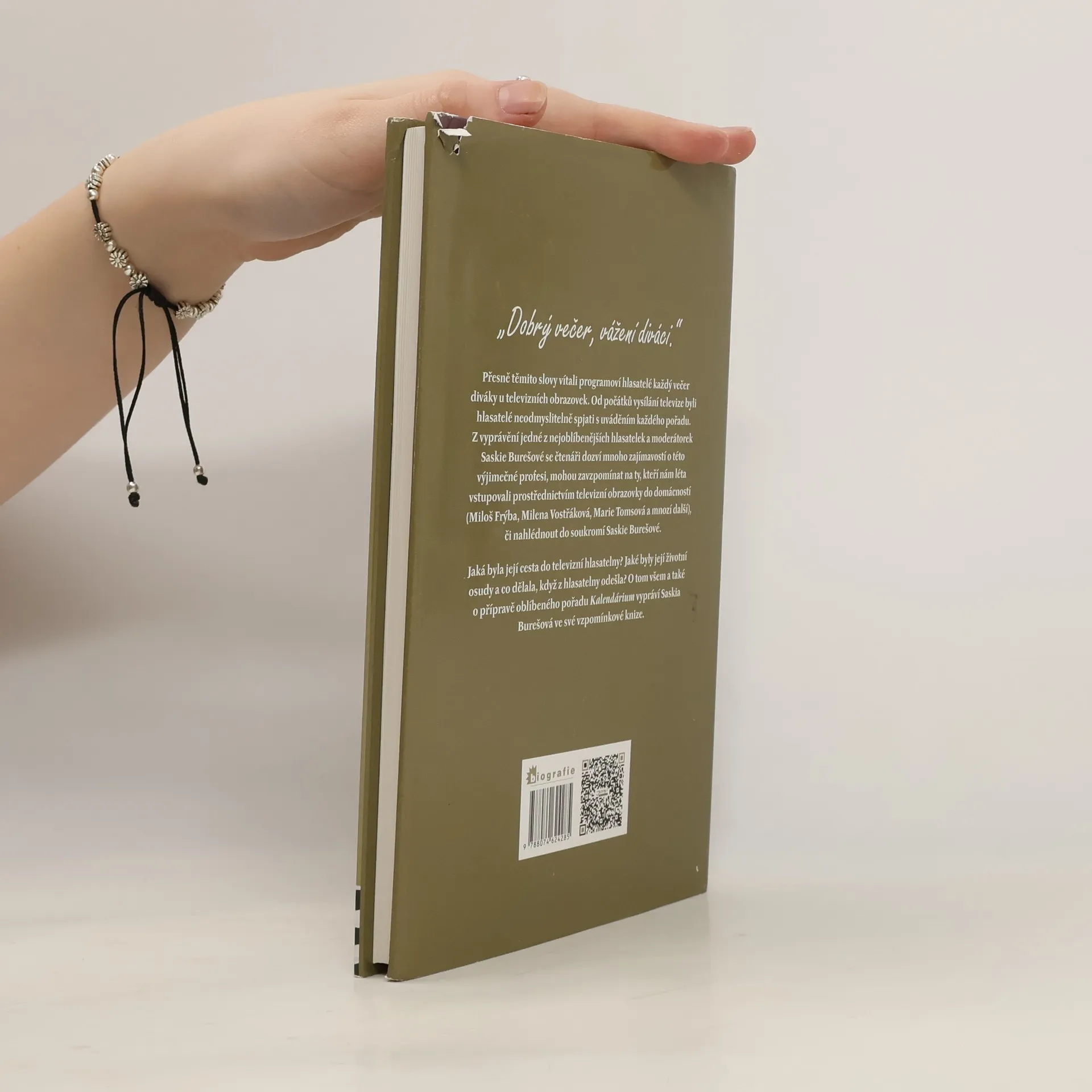 Dobrý večer, vážení diváci. Tak přesně těmito slovy vítali programoví hlasatelé každý večer diváky u televizních obrazovek. Od počátků vysílání televize byli hlasatelé neodmyslitelně spjati s uváděním každého televizního pořadu. Do tohoto období zavede čtenáře nová kniha Vítka Chadimy Saskia. Z vyprávění jedné z nejoblíbenějších hlasatelek a moderátorek Saskie Burešové se čtenář dozví mnoho zajímavostí o této výjimečné profesi a také zavzpomíná na ty, kteří nám léty vstupovali prostřednictvím televizní obrazovky do domácností (Miloš Frýba, Milena Vostřáková, Dagmar Dvořáčková, Marie Tomsová …). Jaká ale byla cesta Saskie Burešové do televizní hlasatelny? Jaké byly její životní osudy a co dělala potom, když z hlasatelny odešla? O tom všem a také o přípravě pořadu Kalendárium vypráví Saskia Burešová ve své vzpomínkové knize. Čtenáře nechává nahlédnout i do svého soukromí, vzpomíná na svoje dětství a vypráví o tom, jak významnou roli v jejím životě hraje rodina. Kniha je kromě bohaté fotogalerie doplněna i vzpomínkami jejích přátel a kamarádů (E. Hrubeš, Y. Simonová, N. Urbánková, N. Konvalinková, M. Tomsová…) a také výčtem jejích profesních aktivit. Tato kniha vám nabídne pohled na život jedné výjimečné ženy, která ve své profesi dosáhla naprosté dokonalosti a vystoupala na pomyslný vrchol jedné televizní profese.