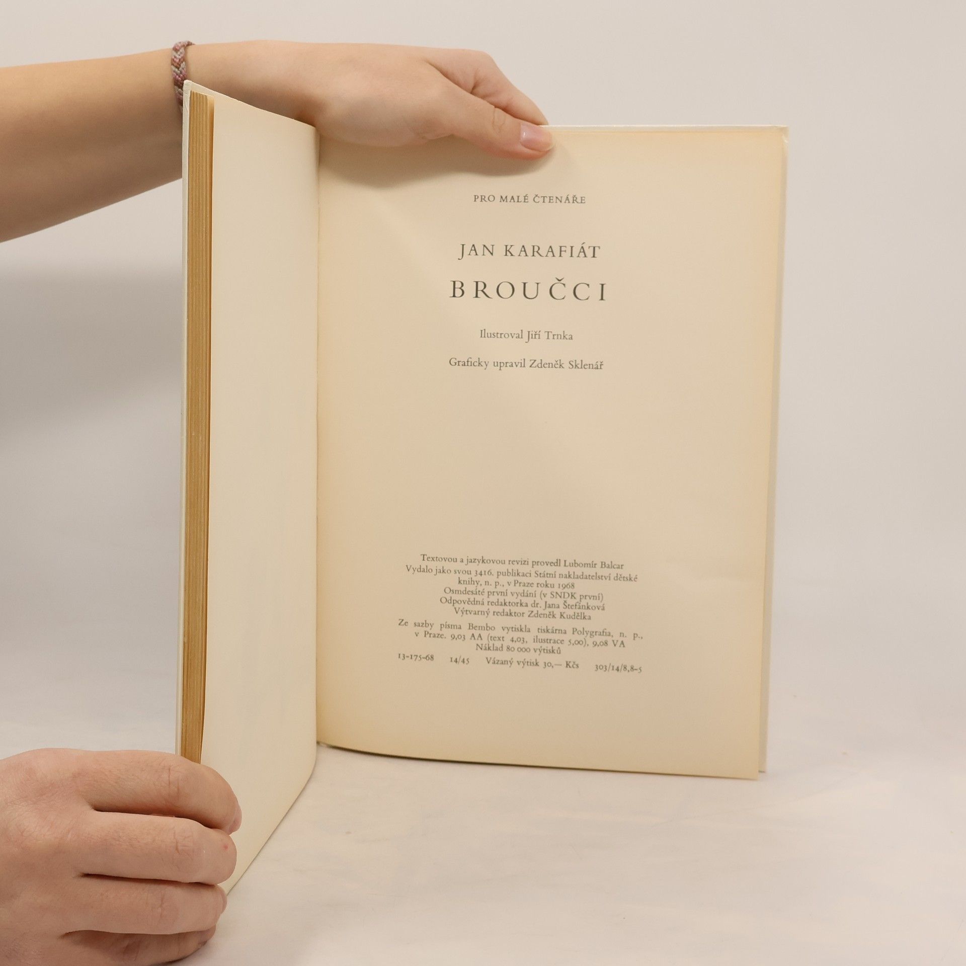 Broučky, jediné umělecké literární dílo Jana Karafiáta (1846–1929), potkaly nejednoduché osudy. Roku 1876 anonymně vyšel skromný, neilustrovaný svazek – tehdy s názvem Broučci pro malé i velké děti – a zapadl vcelku bez povšimnutí. Až teprve po sedmnácti letech knížku objevil a zpopularizoval novinář Gustav Jaroš, který ji označil jako „snad nejkrásnější květ naší české literatury dětské“ a jejího autora nazval „českým Andersenem“. Poetická obraznost Broučků, citlivý přírodní lyrismus a ušlechtilý humanismus si dále uchovávají nepomíjející platnost. I jazykově, svým jadrným básnickým slohem šťastně spojujícím hovorovost lidové řeči s vytříbenými biblismy, je dílo Jana Karafiáta pozoruhodné. Čtenářsky i posluchačsky stále přitažlivé zůstávají postavičky malých hrdinů, broučků a berušek, které při všech svých světlých stránkách nejsou zbaveny pravdivých lidských vlastností. Spolehlivým průvodcem Broučků jsou ilustrace národního umělce Jiřího Trnky, které přes časový odstup od svého vzniku na počátku čtyřicátých let nic nepozbyly ze svého půvabu.