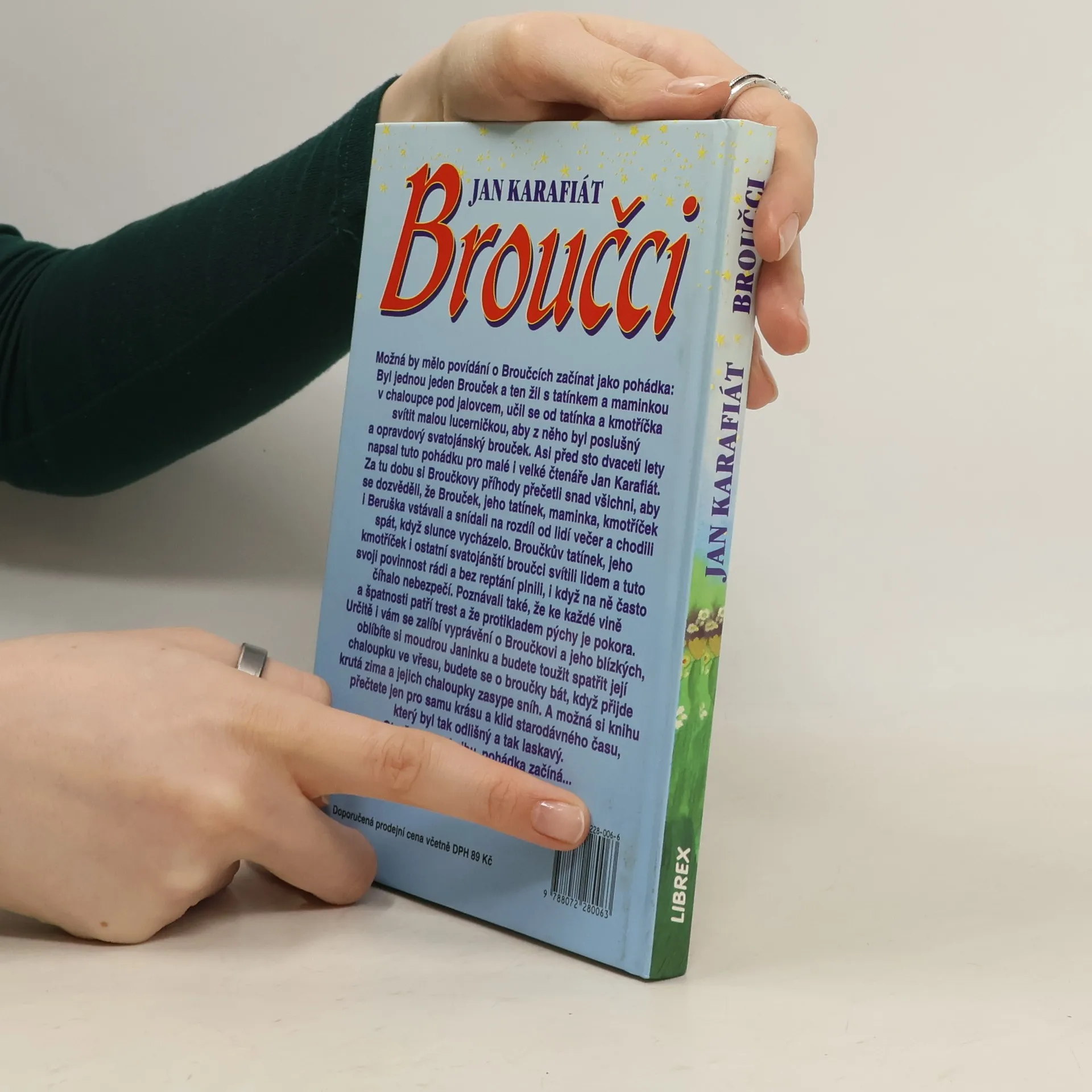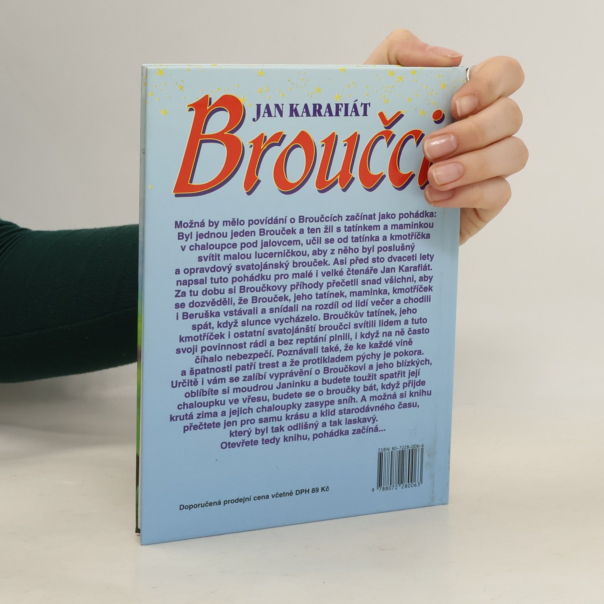 Broučky, jediné umělecké literární dílo Jana Karafiáta (1846–1929), potkaly nejednoduché osudy. Roku 1876 anonymně vyšel skromný, neilustrovaný svazek – tehdy s názvem Broučci pro malé i velké děti – a zapadl vcelku bez povšimnutí. Až teprve po sedmnácti letech knížku objevil a zpopularizoval novinář Gustav Jaroš, který ji označil jako „snad nejkrásnější květ naší české literatury dětské“ a jejího autora nazval „českým Andersenem“. Poetická obraznost Broučků, citlivý přírodní lyrismus a ušlechtilý humanismus si dále uchovávají nepomíjející platnost. I jazykově, svým jadrným básnickým slohem šťastně spojujícím hovorovost lidové řeči s vytříbenými biblismy, je dílo Jana Karafiáta pozoruhodné. Čtenářsky i posluchačsky stále přitažlivé zůstávají postavičky malých hrdinů, broučků a berušek, které při všech svých světlých stránkách nejsou zbaveny pravdivých lidských vlastností. Spolehlivým průvodcem Broučků jsou ilustrace národního umělce Jiřího Trnky, které přes časový odstup od svého vzniku na počátku čtyřicátých let nic nepozbyly ze svého půvabu.