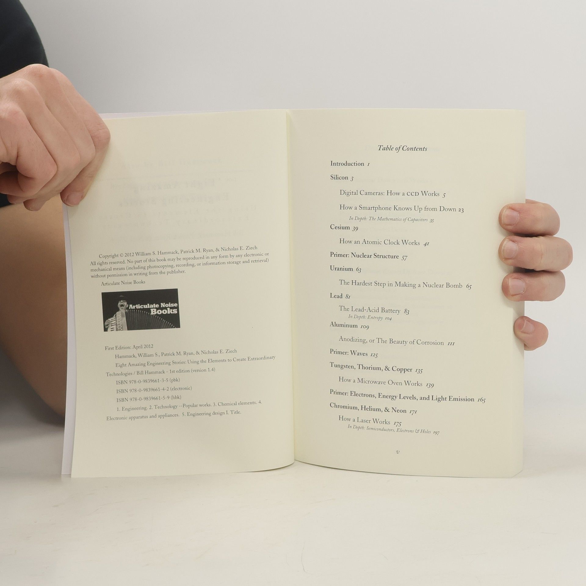 This book reveals some of the stories behind how engineers use specific elements to create the material world around us. In eight chapters, the EngineerGuy team exposes the magnificence of the innovation and engineering of digital camera imagers, tiny accelerometers, atomic clocks, enriching fissile material, batteries, anodizing metals, microwave ovens, and lasers. To help readers of all backgrounds, the book also includes introductions to the scientific principles necessary for a deeper understanding of the material presented in the chapters. The reader will be delighted by primers on waves, nuclear structure, and electronic transitions. It also features “In depth” sections on entropy, semiconductors, and the mathematics of capacitors.
