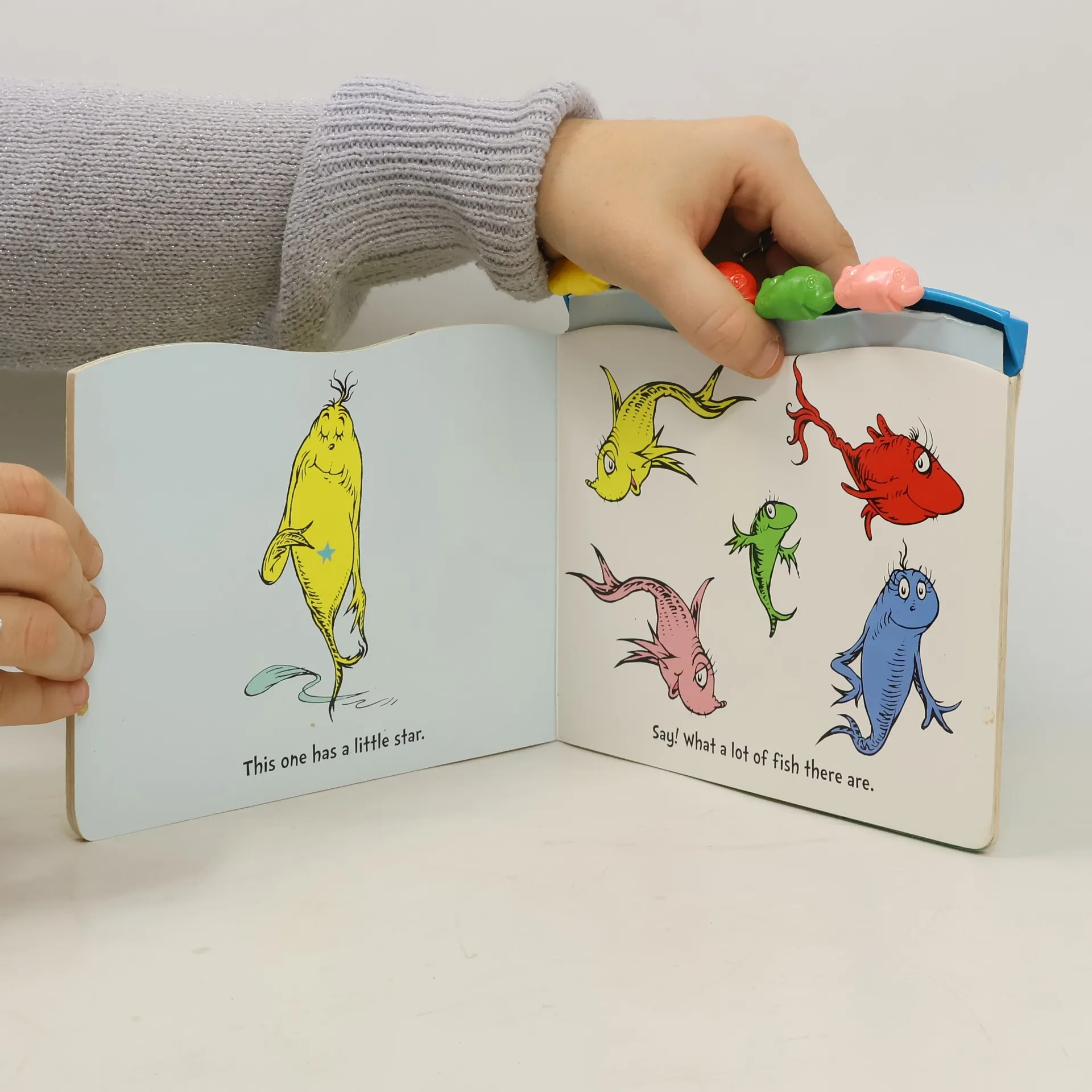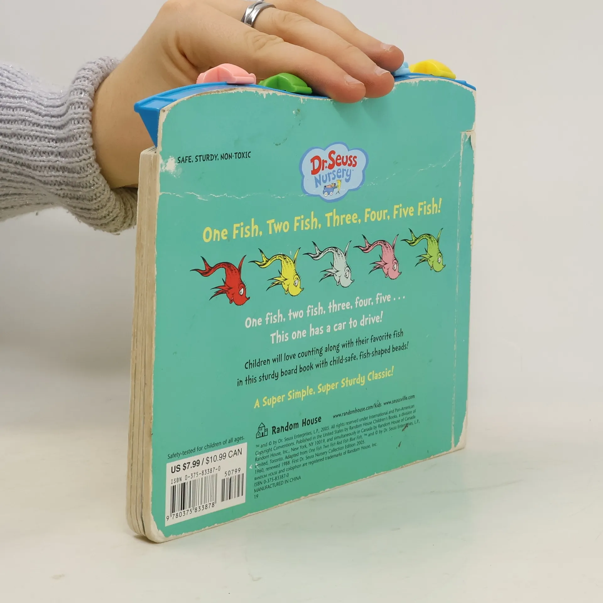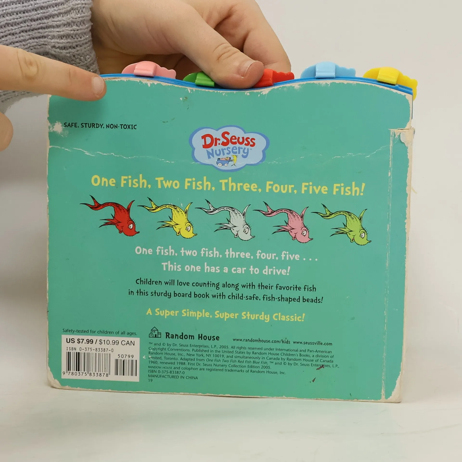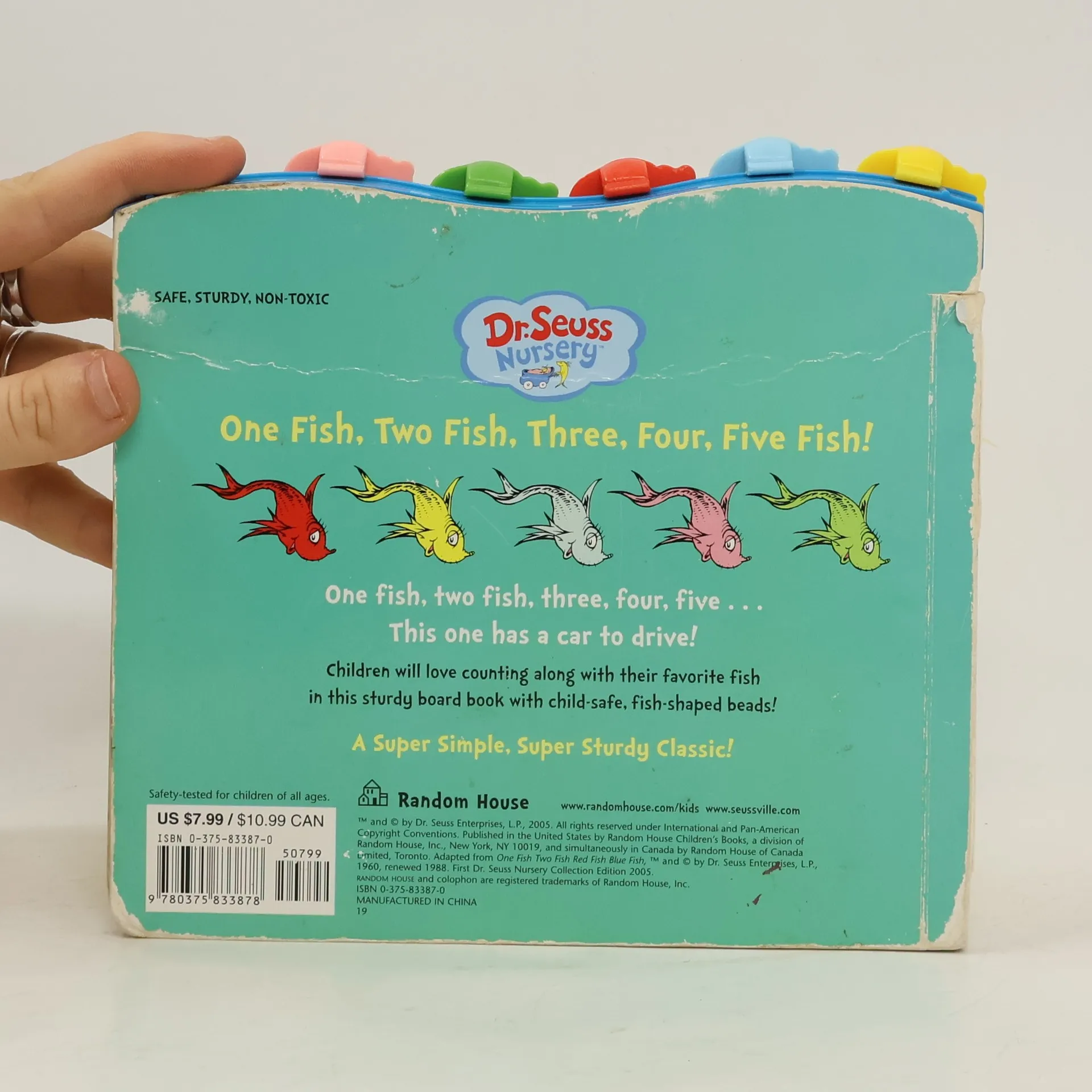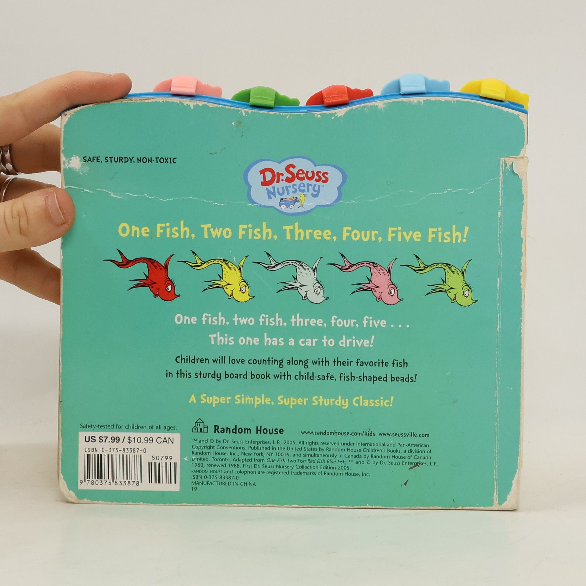 Five fish-shaped beads that move across the top of this sturdy board book allow toddlers to count along as they this adorable book based on the classic Beginner Book One Fish Two Fish Red Fish Blue Fish! Safety-tested for children of all ages, the bright colors and interactive elements will make this a hit with little fish-lovers everywhere!The Dr. Seuss Nursery Collection introduces the most beloved Dr. Seuss characters to the littlest of listeners. Based on Dr. Seuss's signature art and rollicking rhymes, each book introduces the most popular characters of the title on which it's based in a bold and simple format, which will engage babies and toddlers at each stage of development.