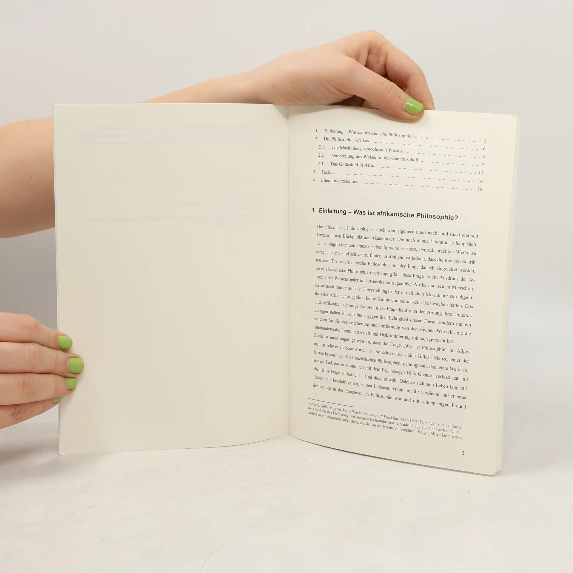 Studienarbeit aus dem Jahr 2001 im Fachbereich Philosophie - Sonstiges, Note: gut (2,0), Ruhr-Universität Bochum (Fakultät für Philosophie), Sprache: Deutsch, Abstract: 1 Einleitung - Was ist afrikanische Philosophie? Die afrikanische Philosophie ist noch weitestgehend unerforscht und rückt erst seit kurzem in den Blickpunkt der Akademiker. Die noch dünne Literatur ist hauptsächlich in englischer und französischer Sprache verfasst, deutschsprachige Werke zu diesem Thema sind schwer zu finden. Auffallend ist jedoch, dass die meisten Schriften zum Thema afrikanische Philosophie mit der Frage danach eingeleitet werden, ob es afrikanische Philosophie überhaupt gibt. [..] Mit dieser Frage stellt Deleuze den Zusammenhang mit der antiken griechischen Philosophie her. Er bezieht sich auf das sokratische "Ich weiß, dass ich nichts weiß" und bleibt an dem Punkt, dass die letzte Weisheit nicht erfassbar ist hängen, der uns mit diesem Satz vermittelt wird. Dies reicht ihm jedoch nicht, er möchte die Philosophie anders definiert wissen. "Die Philosophie ist die Kunst der Bildung, Erfindung, Herstellung von Begriffen."3 Auch diese Ansicht ist nicht neu und wenn wir diese beiden Kriterien als richtig anwenden, können wir nur zu dem Schluss kommen, dass die Frage ob es afrikanische Philosophie gibt nur bejaht werden kann, denn weder kann ernsthaft bestritten werden, dass es auch auf dem afrikanischen Kontinent Menschen gibt, die sich als Freunde der Weisheit sehen und versuchen das Leben und die Welt der Erscheinungen zu hinterfragen und zu begreifen, noch kann bestritten werden, dass auch in Afrika Begriffe im philosophischen Sinne hergestellt wurden und werden. In Afrika findet man hauptsächlich eine Art der Philosophie, die sich zwar von der traditionellen europäischen Form unterscheidet, die dennoch als Philosophie anzusehen ist: Weisheitslehren der Alten und Ahnen, meist mündlich und häufig in Form von Sprichwörtern und Volkssagen überliefert