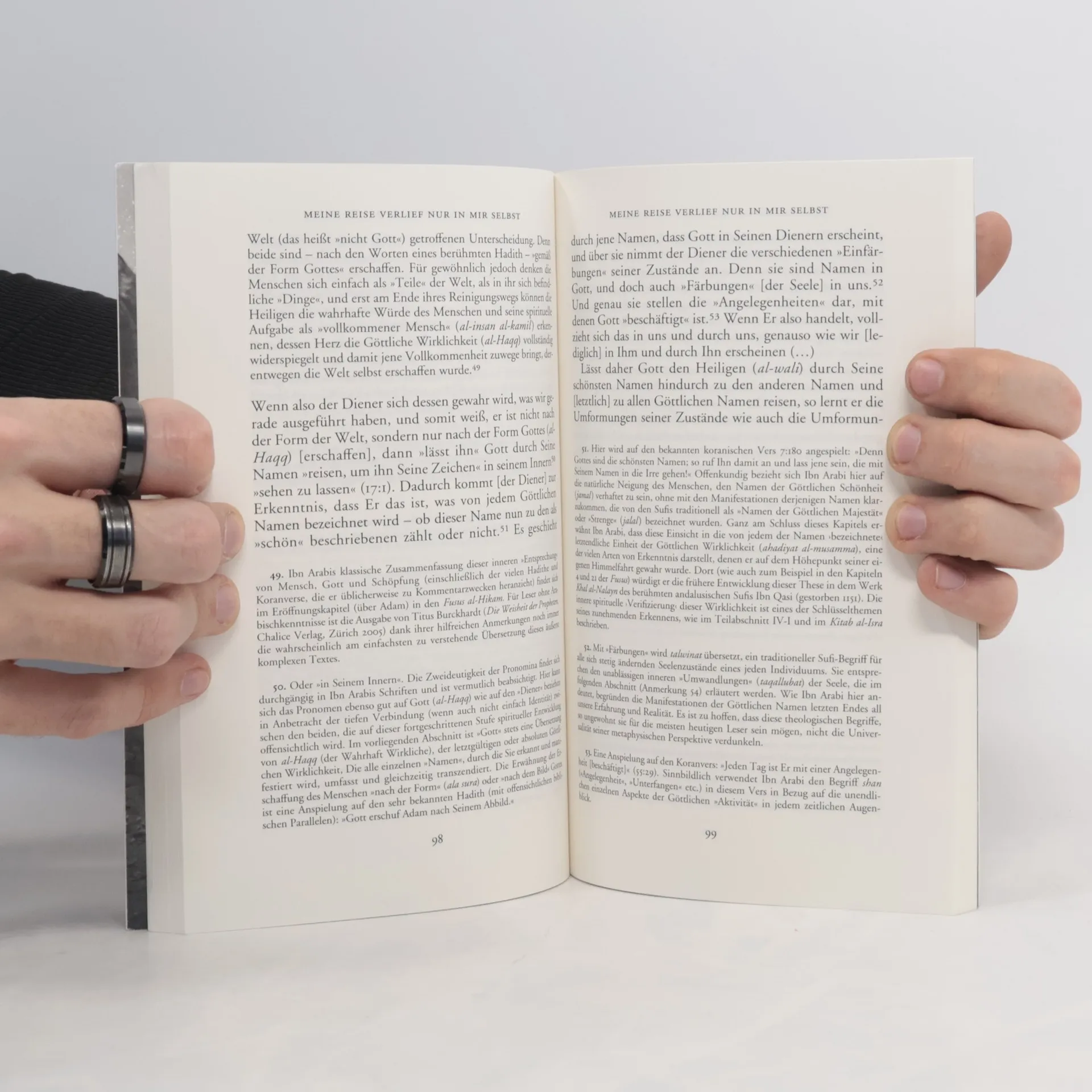 Ich sah dich nicht auf meinem Weg. Gibt es da noch einen anderen Pfad? Jeder hat seinen eigenen Weg, den niemand sonst beschreitet. Diese verschiedenen Wege entstehen durch das Reisen selbst. Zwei Texte des andalusischen Mystikers Ibn Arabi (1165-1240), des größten Meisters, beschreiben die Umstände und Erfahrungen des vollständigen Aufgehens in Gott, in Anspielung auf die berühmte "nachtliche Reise" des Propheten Mohammed. Ibn Arabi reflektiert seinen besonderen Zugang zum Koran und den Hadithen sowie die Breite seiner metaphysisch-theologischen Lehren und seines Interesses an praktischer Spiritualität. Die Erklärung von khalwa, einer Sufi-Ubung zur Erlangung der Gegenwart Gottes, beschreibt den geistigen Aufstieg durch alle Stufen der Existenz bis zur Göttlichen Gegenwart. Er ruft dazu auf, das Herz zu reinigen und eins mit der inneren Essenz zu werden. Mit großer Klarheit und der Überzeugungskraft autobiografischer Passagen schildert Ibn Arabi seine eigene Himmelfahrt im Text "Meine Reise verlief nur in mir selbst", einer hier erstmals auf Deutsch vorliegenden, kommentierten Übersetzung des Kapitels 367 aus seinen umfangreichen Futuhat al-Makkiya.