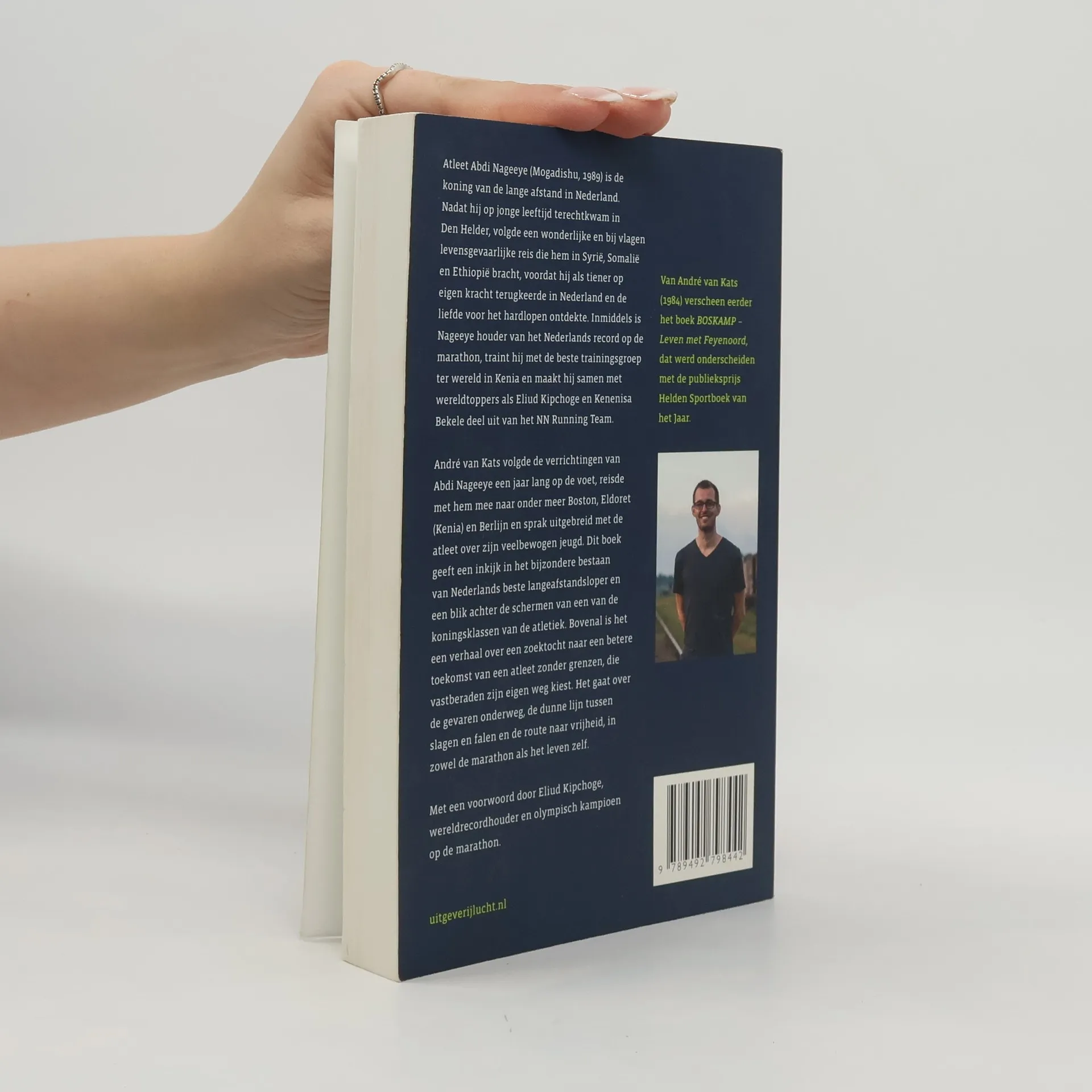 Atleet Abdi Nageeye (Mogadishu, 1989) is de koning van de lange afstand in Nederland. Nadat hij op jonge leeftijd terechtkwam in Den Helder, volgde een wonderlijke en bij vlagen levensgevaarlijke reis die hem in Syrië, Somalië en Ethiopië bracht, voordat hij als tiener op eigen kracht terugkeerde in Nederland en de liefde voor het hardlopen ontdekte. Inmiddels is Nageeye houder van het Nederlands record op de marathon, traint hij met de beste trainingsgroep ter wereld in Kenia en maakt hij samen met wereldtoppers als Eliud Kipchoge en Kenenisa Bekele deel uit van het NN Running Team. André van Kats volgde de verrichtingen van Abdi Nageeye een jaar lang op de voet, reisde met hem mee naar onder meer Boston, Eldoret (Kenia) en Berlijn en sprak uitgebreid met de atleet over zijn veelbewogen jeugd. Dit boek geeft een inkijk in het bijzondere bestaan van Nederlands beste langeafstandsloper en een blik achter de schermen van een van de koningsklassen van de atletiek. Bovenal is het een verhaal over een zoektocht naar een betere toekomst van een atleet zonder grenzen, die vastberaden zijn eigen weg kiest. Het gaat over de gevaren onderweg, de dunne lijn tussen slagen en falen en de route naar vrijheid, in zowel de marathon als het leven zelf. Met een voorwoord door Eliud Kipchoge, wereldrecordhouder en olympisch kampioen op de marathon. Van André van Kats (1984) verscheen eerder het boek BOSKAMP - Leven met Feyenoord, dat werd onderscheiden met de publieksprijs Helden Sportboek van het Jaar.
