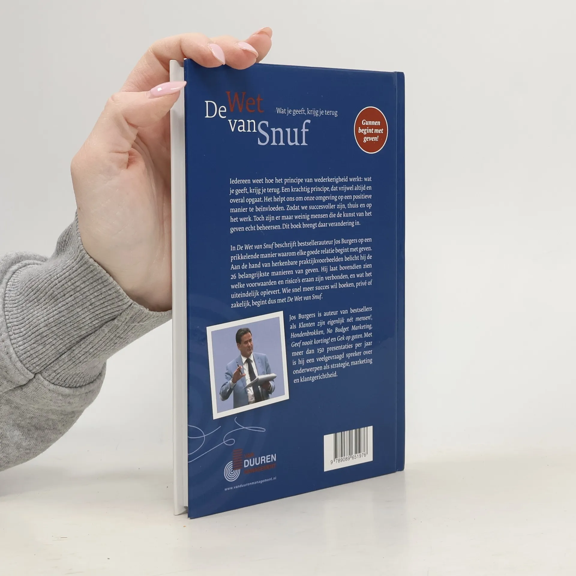 Iedereen weet hoe het principe van wederkerigheid werkt: wat je geeft, krijg je terug. Een krachtig principe, dat vrijwel altijd en overal opgaat. Het helpt ons om onze omgeving op een positieve manier te beïnvloeden. Zodat we succesvoller zijn, thuis en op het werk. Toch zijn er maar weinig mensen die de kunst van het geven echt beheersen. Dit boek brengt daar verandering in. In De Wet van Snuf beschrijft bestsellerauteur Jos Burgers op een prikkelende manier waarom goede relaties beginnen met geven. Aan de hand van herkenbare praktijkvoorbeelden belicht hij de 26 belangrijkste manieren van geven. Hij laat bovendien zien welke voorwaarden en risico's eraan zijn verbonden, en wat het uiteindelijk oplevert. Wie snel meer succes wil boeken, privé of zakelijk, begint dus met De Wet van Snuf. Een prikkelend boek over de 26 belangrijkste manieren van gevenDe snelste weg naar betere relaties, thuis en op het werkDe royalty's van dit boek gaan naar de stichting Hulphond Nederland