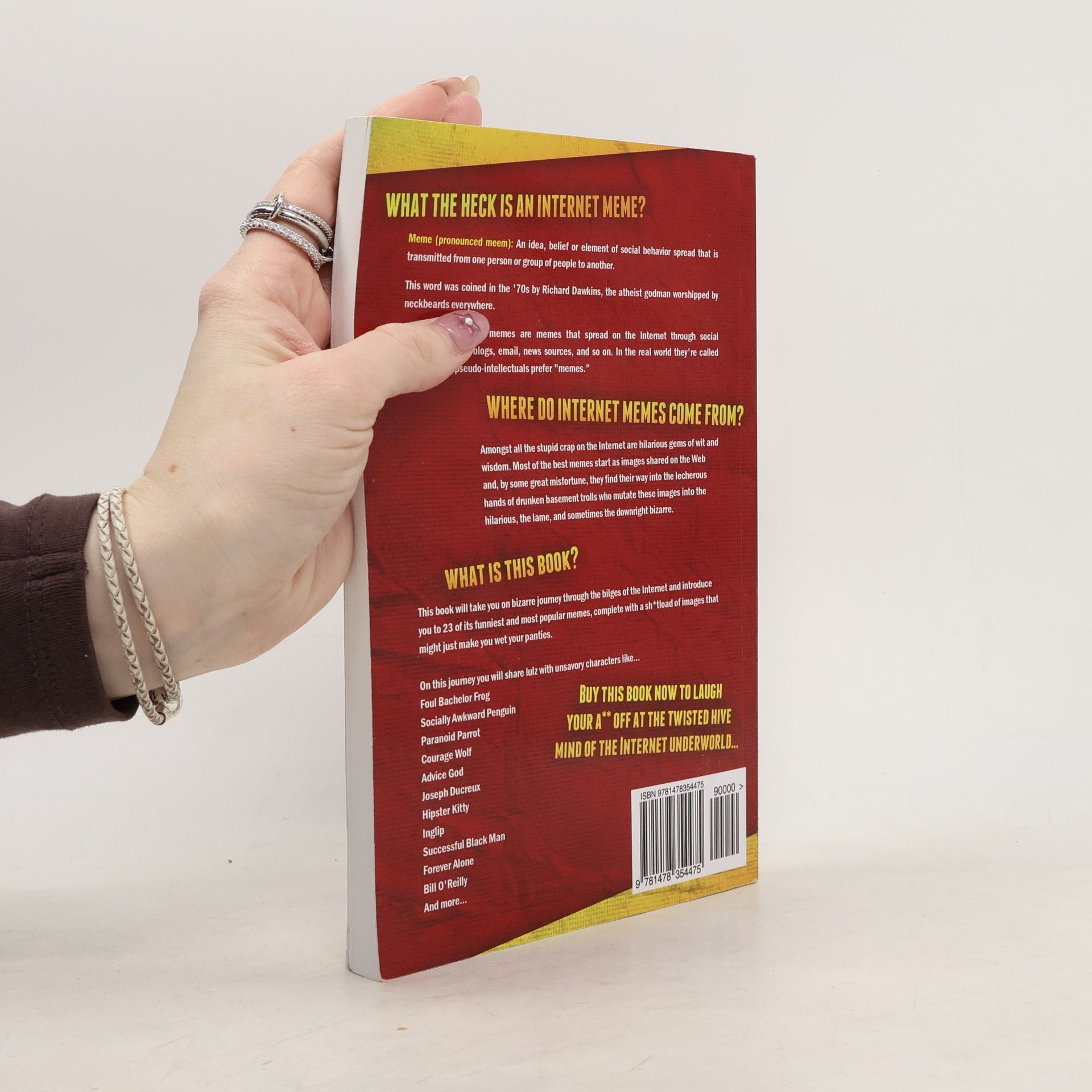 WHAT THE HECK IS AN INTERNET MEME? Meme (pronounced meem): An idea, belief or element of social behavior spread that is transmitted from one person or group of people to another. This word was coined in the '70s by Richard Dawkins, the atheist godman worshipped by neckbeards everywhere. Simply put, Internet memes are memes that spread on the Internet through social networking sites, blogs, email, news sources, and so on. In the real world they're called "ideas," but pseudo-intellectuals prefer "memes." WHERE DO INTERNET MEMES COME FROM? Amongst all the stupid crap on the Internet are hilarious gems of wit and wisdom. Most of the best memes start as images shared on the Web and, by some great misfortune, they find their way into the lecherous hands of drunken basement trolls who mutate these images into the hilarious, the lame, and sometimes the downright bizarre. WHAT IS THIS BOOK? This book will take you on bizarre journey through the bilges of the Internet and introduce you to 23 of its funniest and most popular memes. On this journey you will share lulz with unsavory characters like... Foul Bachelor Frog Socially Awkward Penguin Paranoid Parrot Courage Wolf Advice God Joseph Ducreux Hipster Kitty Inglip Successful Black Man Forever Alone Bill O'Reilly And more...