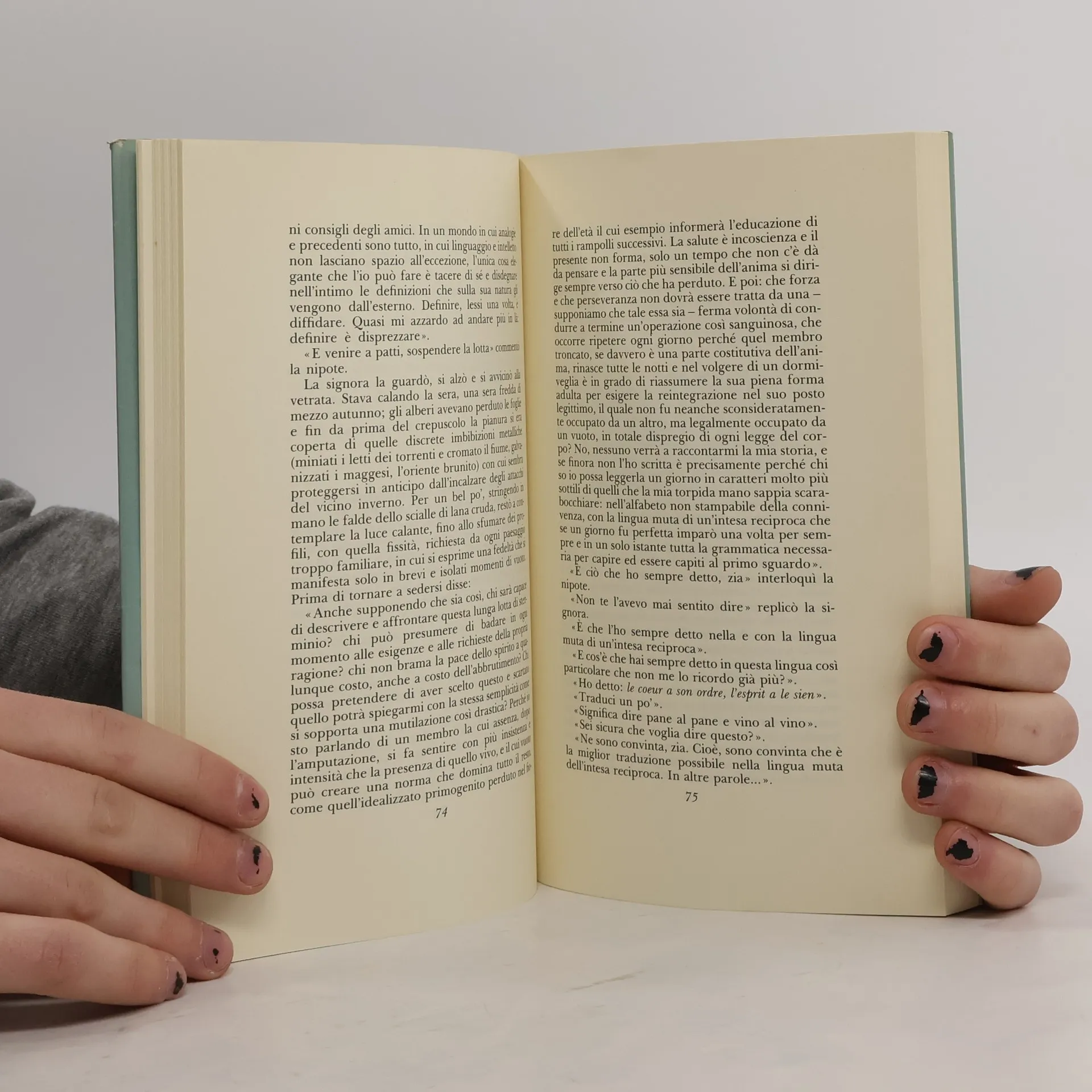 Due donne, una anziana e una giovane, zia e nipote, siedono in un ampio studio e conversano. Parlano di un messaggero atteso, il cui messaggio dovrebbe sanare una ferita del passato. La vecchia afferma: «Nemmeno per un istante ... ho dubitato della veracità di quel che veniva a comunicarmi il messaggero». Le due donne sono presenze romanzesche che prendono vita con le loro parole. La zia è una teologa esperta, mentre la nipote è testarda, aforistica, e capace di rispondere con battute taglienti. La loro conversazione è intensa e complessa, rivelando gradualmente un segreto del passato, un fatto da smascherare ma anche da nascondere, legato a una «barbara usanza» avvenuta il giorno delle nozze della zia, quando entrò nella tribù degli Amat. Qual è il legame tra quell'oltraggio e il messaggio che dovrebbe risolverlo? Ogni elemento del racconto è sia fisico che metafisico, espresso in una prosa densa e potente. Il lettore rimane in sospeso fino alla fine, guidato da un burattinaio che agisce «nella penombra» con maestria, mentre il destino si fa sentire intorno a loro. Il romanzo è stato pubblicato per la prima volta in Spagna nel 1989.