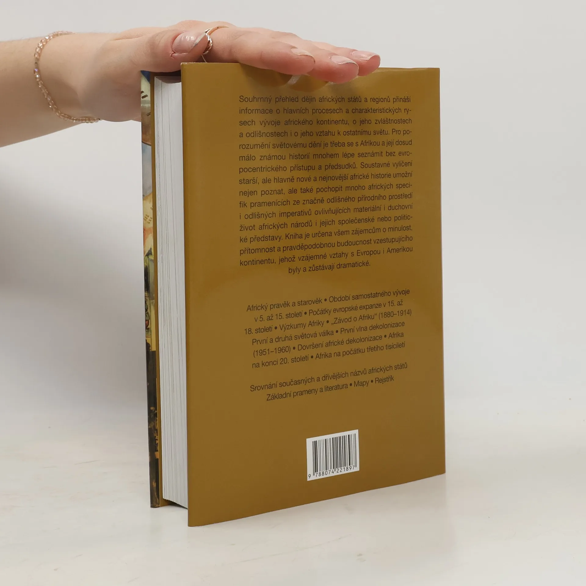 Souhrnný přehled dějin afrických států a regionů přináší informace o hlavních procesech a charakteristických rysech vývoje afrického kontinentu, o jeho zvláštnostech a odlišnostech i o jeho vztahu k ostatnímu světu. Pro porozumění světovému dění je třeba se s Afrikou a její dosud málo známou historií mnohem lépe seznámit bez evropocentrického přístupu a předsudků. Soustavné vylíčení starší, ale hlavně nové a nejnovější africké historie umožní nejen poznat, ale také pochopit mnoho afrických specifik pramenících ze značně odlišného přírodního prostředí i odlišných imperativů ovlivňujících materiální i duchovní život afrických národů i jejich společenské nebo politické představy. Kniha je určena všem zájemcům o minulost, přítomnost a pravděpodobnou budoucnost vzestupujícího kontinentu, jehož vzájemné vztahy s Evropou i Amerikou byly a zůstávají dramatické.