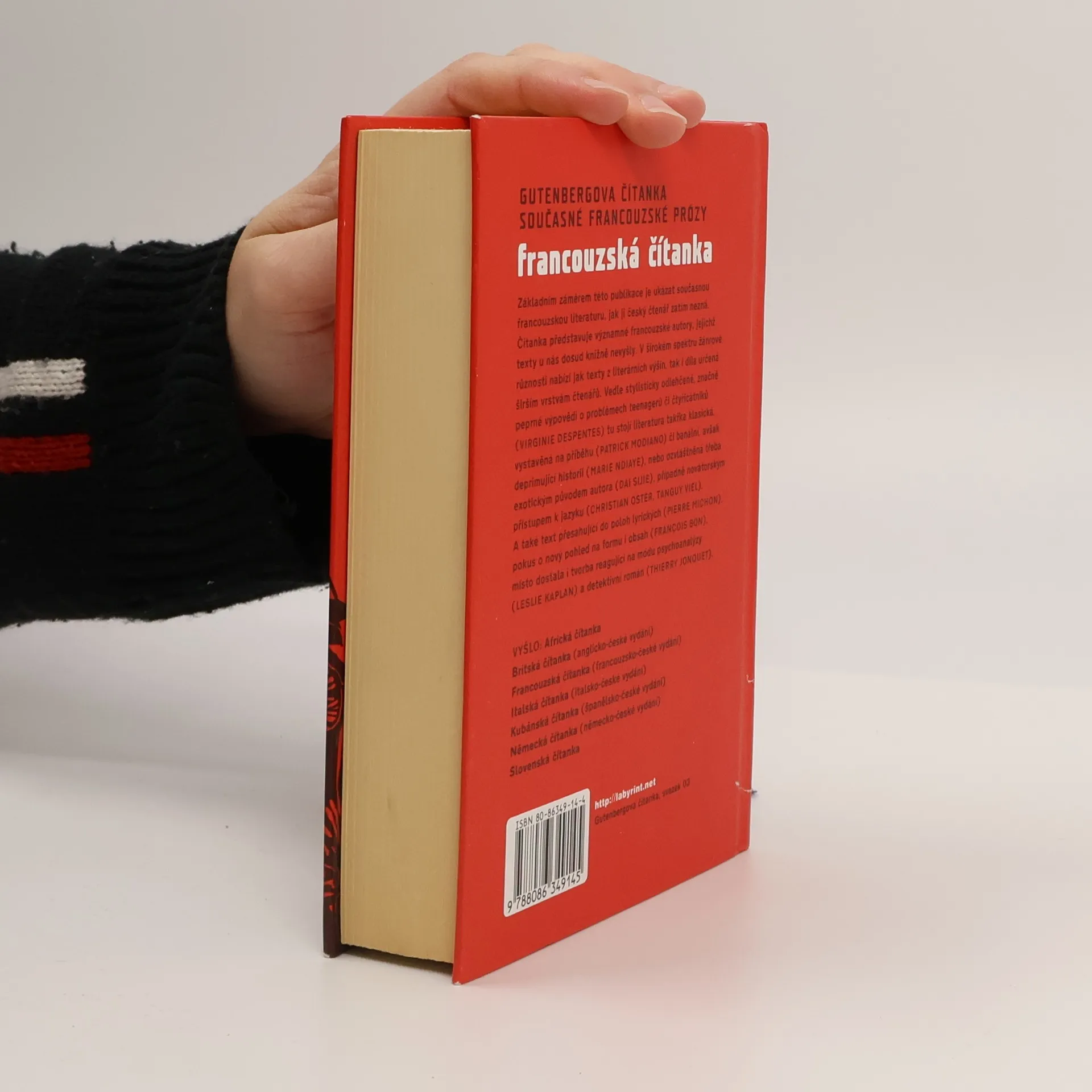 Gutenbergova čítanka současné francouzské prózy. Hlavním záměrem dvojjazyčné publikace je představit rozpětí současné francouzské prózy především ukázkami z děl významných, dosud u nás nepřeložených autorů. Výběr zahrnuje ukázky z díla deseti osobností, jak mladých, tak i známých autorů, jejichž knihy vyšly ve francouzštině v časovém rozmezí let 1994-2004. Editoři se snažili obsáhnout široké spektrum žánrové různorodosti současné francouzské tvorby a tak je v antologii kromě literatury náročné a téměř klasické zastoupena i próza zábavná a oddechová. Publikace, která samozřejmě nemůže být vyčerpávajícím přehledem, je doplněna medailony autorů, medailony překladatelů, bibliografií a komentářem. 1. vyd.
