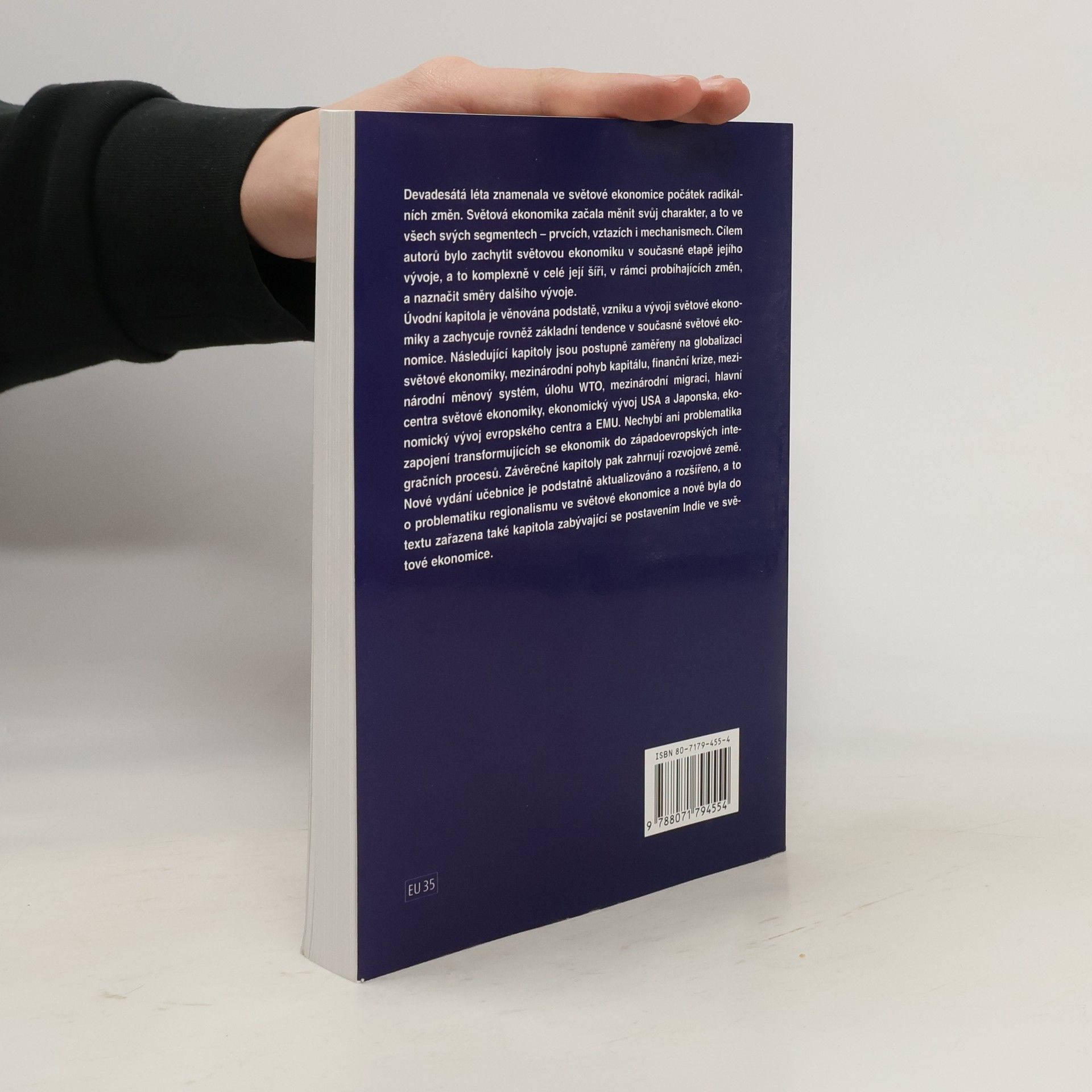 Devadesátá léta znamenala ve světové ekonomice počátek radikálních změn. Světová ekonomika začala měnit svůj charakter, a to ve všech svých segmentech ? prvcích, vztazích i mechanismech. Cílem autorů bylo zachytit světovou ekonomiku v současné etapě jejího vývoje, a to komplexně v celé její šíři, v rámci probíhajících změn, a naznačit směry dalšího vývoje. Úvodní kapitola je věnována podstatě, vzniku a vývoji světové ekonomiky a zachycuje rovněž základní tendence v současné světové ekonomice. Následující kapitoly jsou postupně zaměřeny na globalizaci světové ekonomiky, mezinárodní pohyb kapitálu, finanční krize, mezinárodní měnový systém, úlohu WTO, mezinárodní migraci, hlavní centra světové ekonomiky, ekonomický vývoj USA a Japonska, ekonomický vývoj evropského centra a EMU. Nechybí ani problematika zapojení transformujících se ekonomik do západoevropských integračních procesů. Závěrečné kapitoly pak zahrnují rozvojové země. Nové vydání učebnice je podstatně aktualizováno a rozšířeno, a to o problematiku regionalismu ve světové ekonomice a nově byla do textu zařazena také kapitola zabývající se postavením Indie ve světové ekonomice.