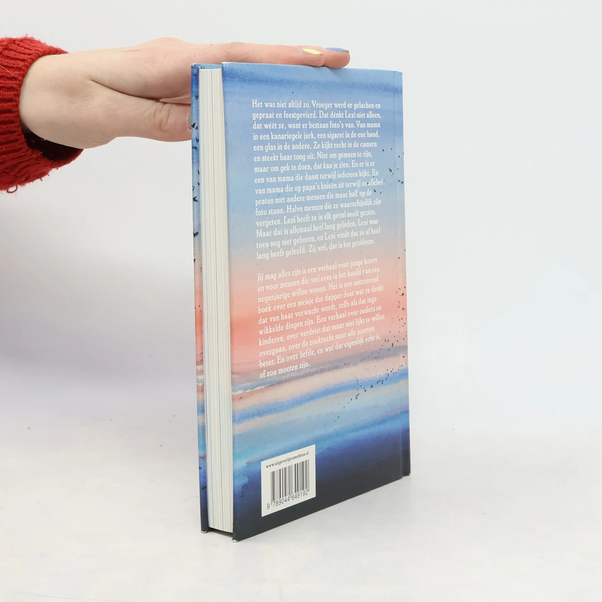 Het was niet altijd zo. Vroeger werd er gelachen en gepraat en feestgevierd. Dat dénkt Lexi niet alleen, dat wéét ze, want er bestaan foto’s van. Van mama in een kanariegele jurk, een sigaret in de ene hand, een glas in de andere. Ze kijkt recht in de camera en steekt haar tong uit. Niet om gemeen te zijn, maar om gek te doen, dat kan je zien. En er is er een van mama die danst terwijl iedereen kijkt. En van mama die op papa’s knieën zit terwijl ze allebei praten met andere mensen die maar half op de foto staan. Halve mensen die ze waarschijnlijk zijn vergeten. Lexi heeft ze in elk geval nooit gezien.Maar dat is allemaal heel lang geleden. Lexi was toen nog niet geboren, en Lexi vindt dat ze al heel lang heeft geleefd. Zij wel, dat is het probleem.Jij mag alles zijn is een verhaal voor jonge lezers en voor mensen die wel eens in het hoofd van een negenjarige willen wonen. Het is een ontroerend boek over een meisje dat dapper doet wat ze denkt dat van haar verwacht wordt, zelfs als dat ingewikkelde dingen zijn. Een verhaal over ouders en kinderen, over verdriet dat maar niet lijkt te willen overgaan, over de zoektocht naar alle soorten beter. En over liefde, en wat dat eigenlijk echt is, of zou moeten zijn.