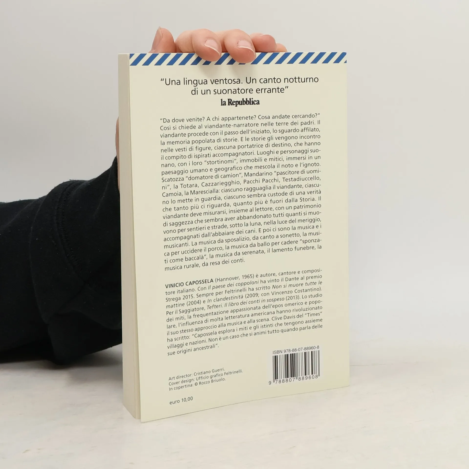Tutto era materia. Lo spirito scappava. “Da dove venite? A chi appartenete? Cosa andate cercando?” Così si interroga il viandante-narratore nelle terre dei padri. Procede con passo deciso, sguardo acuto e memoria ricca di storie, che si manifestano attraverso figure portatrici di destino, ispirati accompagnatori. Luoghi e personaggi, con i loro “stortinomi”, emergono in un paesaggio che fonde il noto e l’ignoto. Scatozza “domatore di camion”, Mandarino “pascitore di uomini”, e altri personaggi, ognuno con la propria saggezza, avvertono il viandante, rivelando verità che sfuggono alla Storia. Il viandante e il lettore si confrontano con un patrimonio di saggezza che sembra abbandonare chi percorre sentieri e strade, sotto la luna o nella luce del meriggio, accompagnati dal latrare dei cani. La musica permea l’opera: da sposalizio, da canto, per uccidere il porco, da ballo, serenate e lamenti funebri. Vinicio Capossela crea un’opera memorabile, in cui la realtà si svela dietro un velo che offre una visione grandiosa ed epica dell’esistenza umana, riportando alla luce misteri e splendori che illuminano il caos della nostra vita.