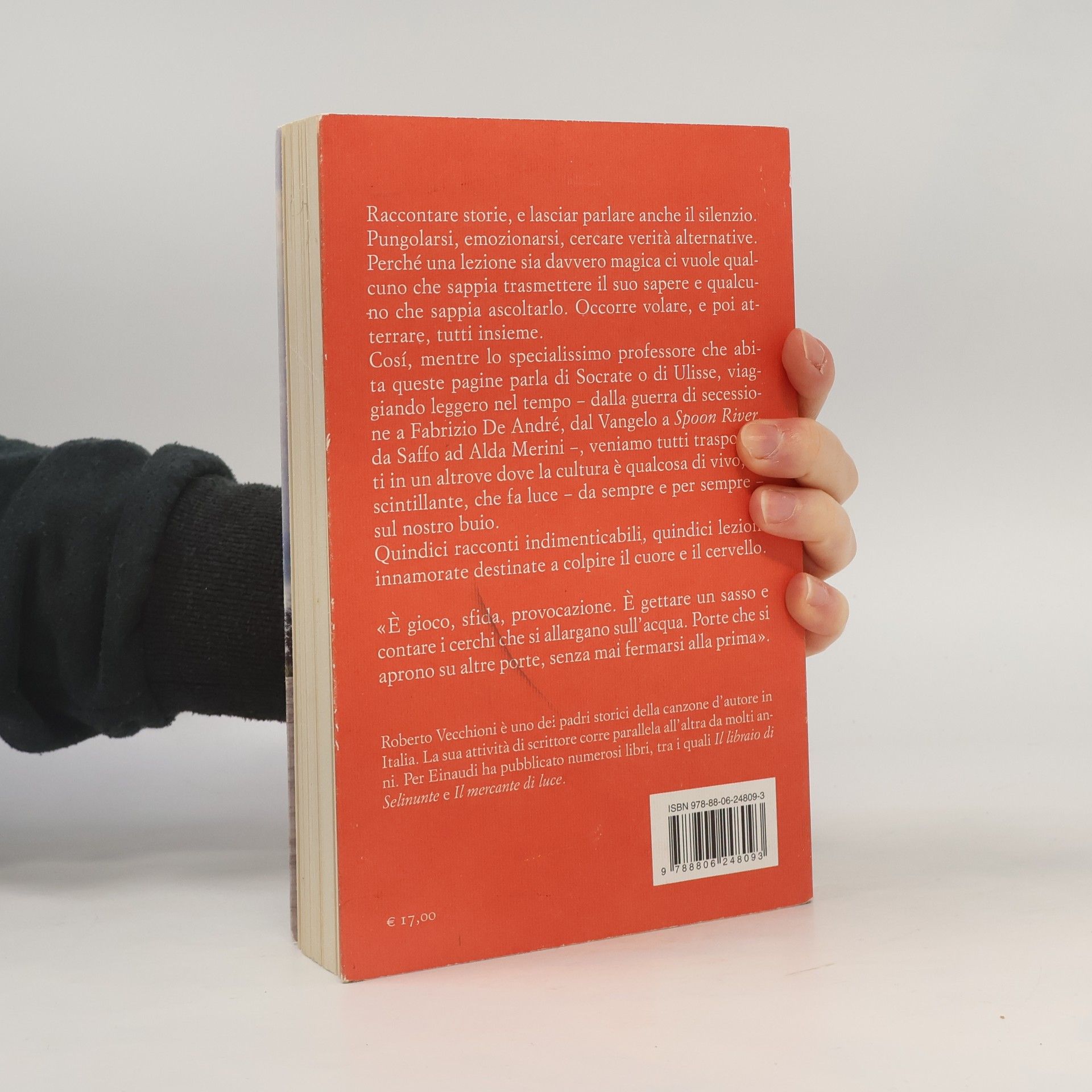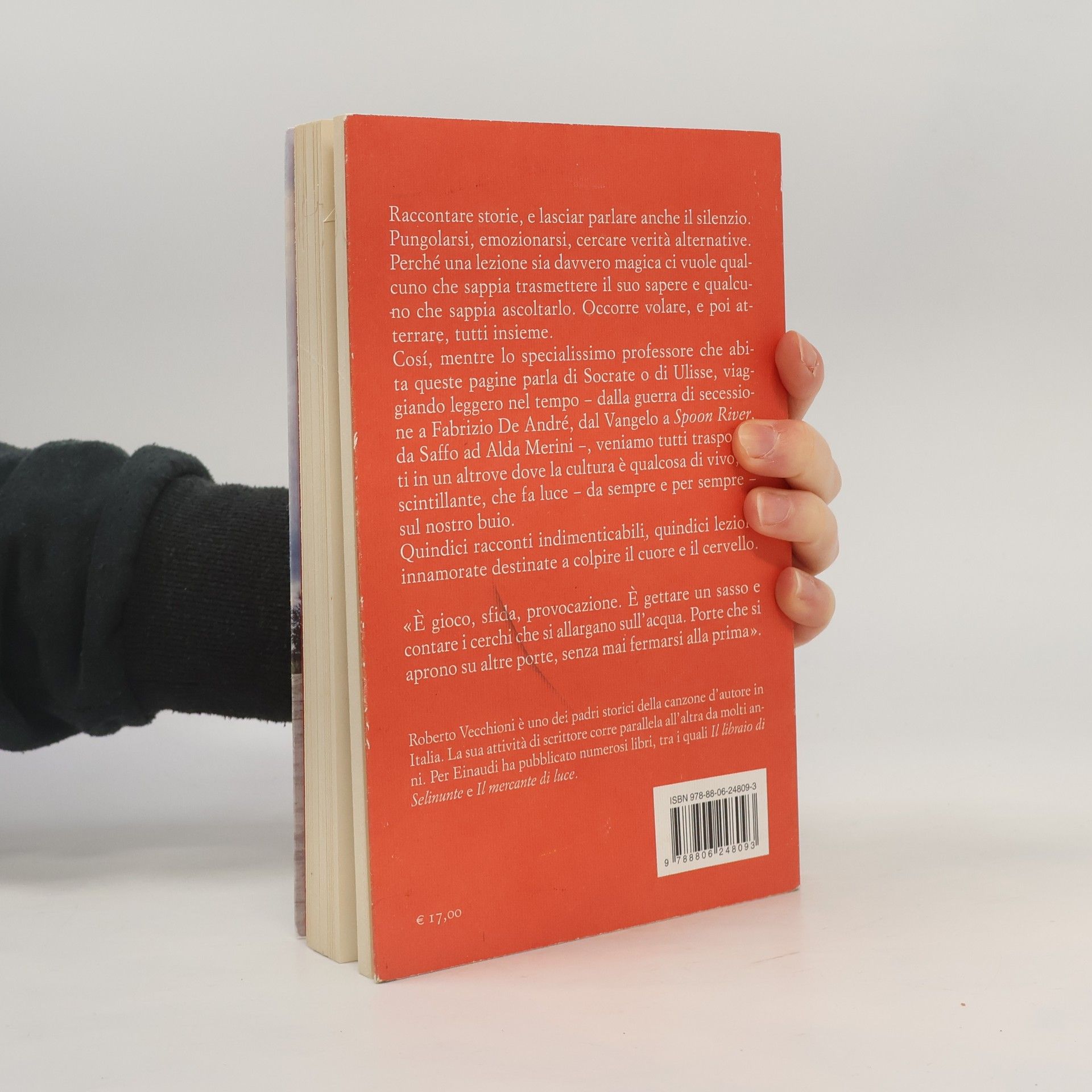 Raccontare storie e dare voce al silenzio. Una lezione magica richiede chi sa trasmettere il sapere e chi sa ascoltarlo. Occorre volare insieme, atterrare insieme. Lo specialissimo professore di queste pagine parla di Socrate e Ulisse, viaggiando nel tempo – dalla guerra di secessione a Fabrizio De André, dal Vangelo a Spoon River, da Saffo ad Alda Merini – trasportandoci in un altrove dove la cultura è viva e scintillante, illuminando il nostro buio. Quindici racconti indimenticabili, quindici lezioni destinate a colpire il cuore e il cervello. Ci si dava appuntamento in un parco, sparsi, chi in piedi, chi sdraiato, e si iniziava. «Questo era il gioco: aggirare l’ovvio, non ripetere il risaputo, aprire strade, sondare il possibile». La scuola di Roberto Vecchioni è un luogo dove si insegna senza impartire lezioni. I ragazzi, veri e irrequieti, hanno coraggio, desideri e paure. Si chiamano come i più celebri pittori, ma sono esseri umani in cerca di se stessi. Vecchioni, colto e originale, è appassionato e sempre pronto a quell’incantesimo che cambia ogni giorno. Che parli di Socrate, Ulisse o di una poetessa contemporanea, i suoi occhi brillano e la sua voce canta. Con le parole, i suoi ragazzi affronteranno la vita, offrendo una potente forma di verità.