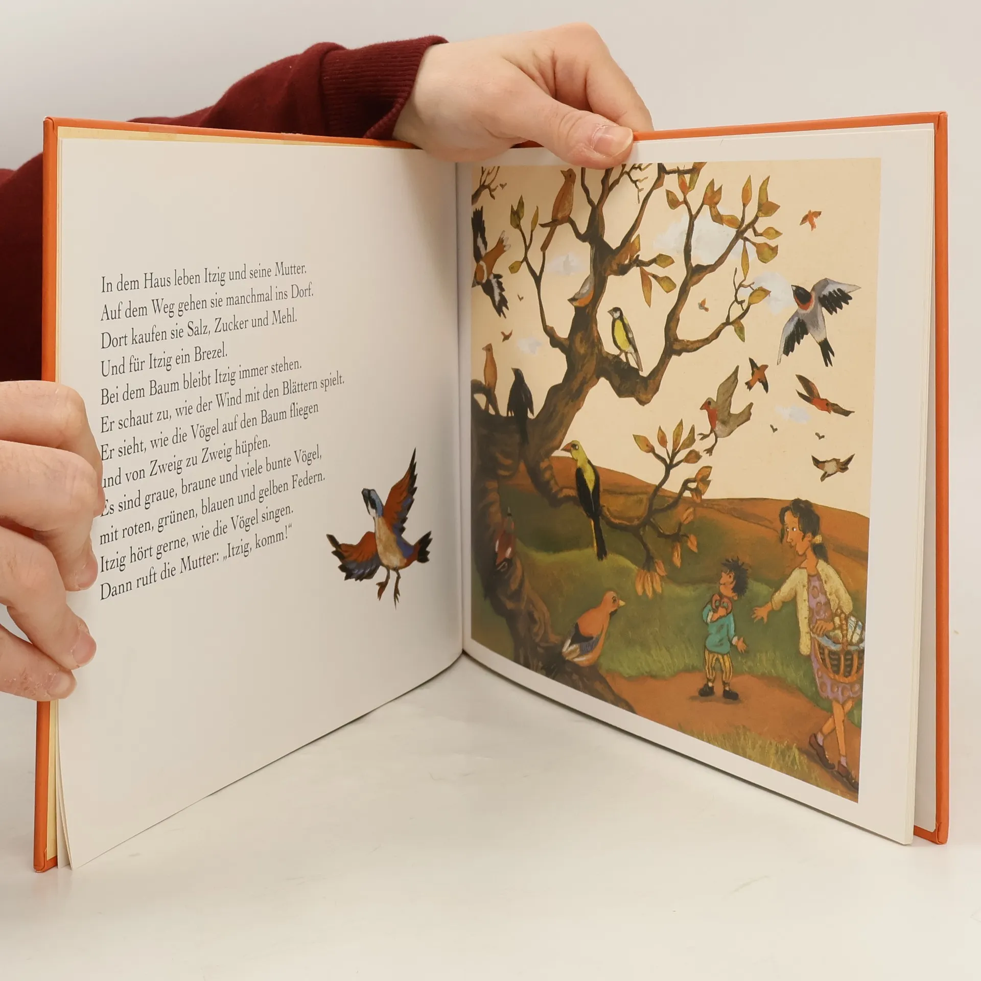 Ein Junge möchte fliegen können wie ein Vogel: Einsam und ohne Blätter steht er da, der verknorrte Baum, der im Sommer noch im grünen Blätterkleid umgeben von kreischenden Vögeln war. Doch nun sind alle fortgeflogen und Stille und Alleinsein herrschen um den Baum. Ein kleiner Junge namens Itzig, der in der Nähe in einem Haus lebt, hat Mitleid mit ihm und möchte auch fliegen können wie ein Vogel, um dem Baum Gesellschaft zu leisten. Doch nachdem ihn die besorgte Mutter mit dicken Winterkleidern ausgerüstet hat, merkt Itzig, dass sein Wunsch unerfüllbar ist. Bald jedoch hat er eine andere Idee ... Rührend und ungemein stimmungsvoll ist diese Geschichte, welcher ein Gedicht von Itzig Manger zugrunde liegt. Ausdrucksstarke, wunderbare Bilder berühren und fesseln beim Betrachten. Ab 5 Jahren, ausgezeichnet, Frau BB.