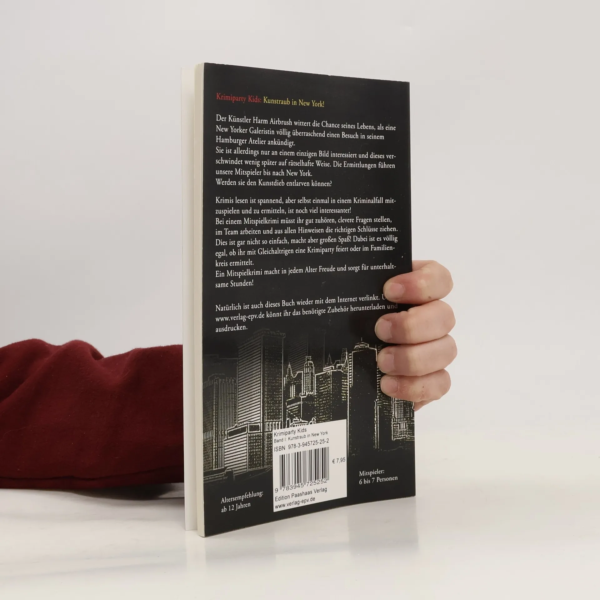 Krimiparty Kids: Kunstraub in New York! Der Künstler Harm Airbrush wittert die Chance seines Lebens, als eine New Yorker Galeristin völlig überraschend einen Besuch in seinem Hamburger Atelier ankündigt. Sie ist allerdings nur an einem einzigen Bild interessiert und dieses verschwindet wenig später auf rätselhafte Weise. Die Ermittlungen führen unsere Mitspieler bis nach New York. Werden sie den Kunstdieb entlarven können? Krimis lesen ist spannend, aber selbst einmal in einem Kriminalfall mitzuspielen und zu ermitteln, ist noch viel interessanter! Bei einem Mitspielkrimi müsst ihr gut zuhören, clevere Fragen stellen, im Team arbeiten und aus allen Hinweisen die richtigen Schlüsse ziehen. Dies ist gar nicht so einfach, macht aber großen Spaß! Dabei ist es völlig egal, ob ihr mit Gleichaltrigen eine Krimiparty feiert oder im Familienkreis ermittelt. Ein Mitspielkrimi macht in jedem Alter Freude und sorgt für unterhaltsame Stunden! Anders als bei der beliebten Krimiparty-Reihe geht es bei der Krimiparty Kids nicht um Mord. Daher sind diese Ermittlungen auch für ein jüngeres Publikum bestens geeignet. Natürlich ist auch dieses Buch wieder mit dem Internet verlinkt. Unter www.verlag-epv.de könnt ihr das benötigte Zubehör herunterladen und ausdrucken. Altersempfehlung: ab 12 Jahren Mitspieler: 6 bis 7 Personen