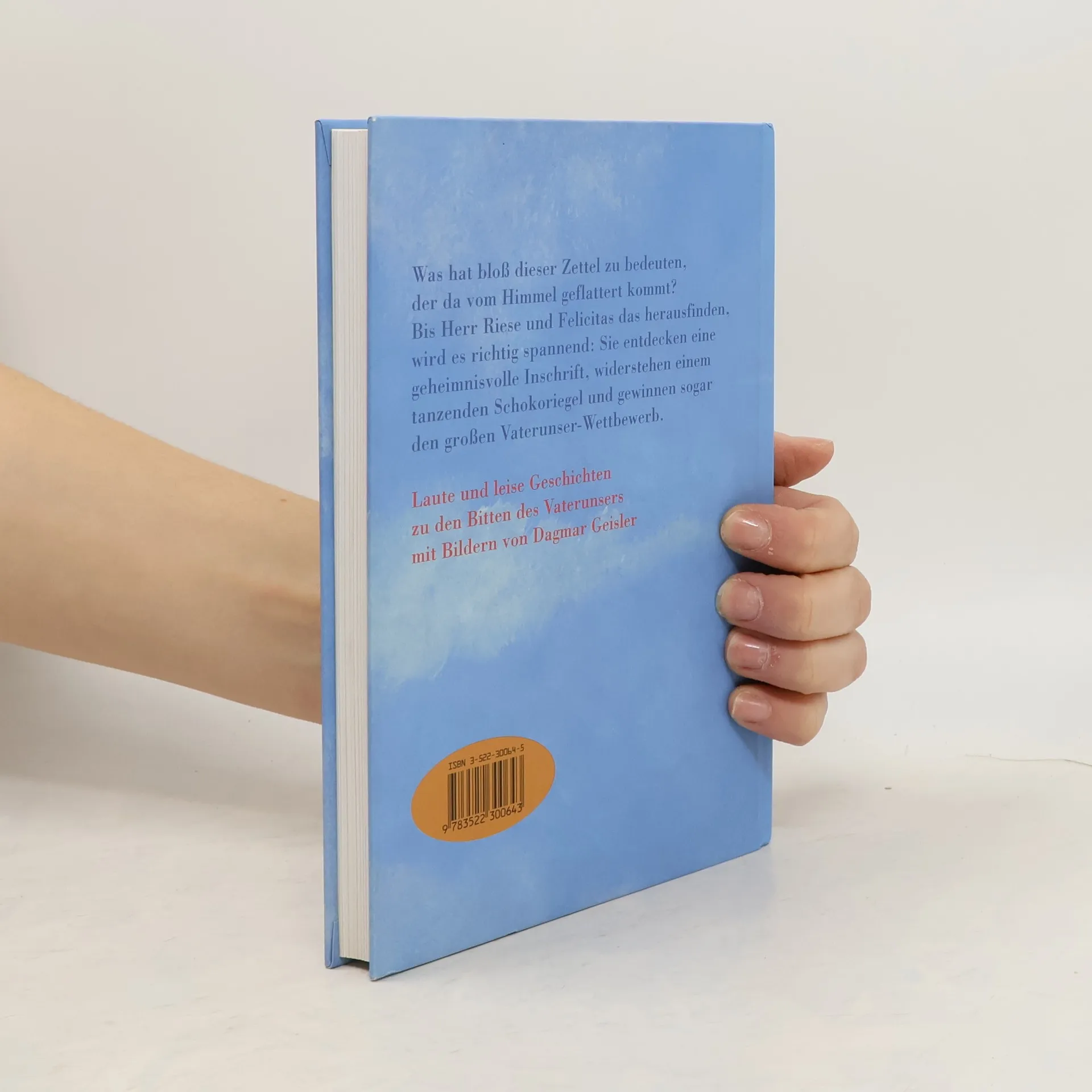 Was hat bloß dieser Zettel zu bedeuten, der da vom Himmel geflattert kommt? Bis Herr Riese und Felicitas das herausfinden, wird es richtig spannend: Sie entdecken eine geheimnisvolle Inschrift, widerstehen einem tanzenden Schokoriegel und gewinnen sogar den großen Vaterunser-Wettbewerb. Laute und leise Geschichten zu den Bitten des Vaterunsers mit Bildern von Dagmar Geisler. Ab 6 Jahren
