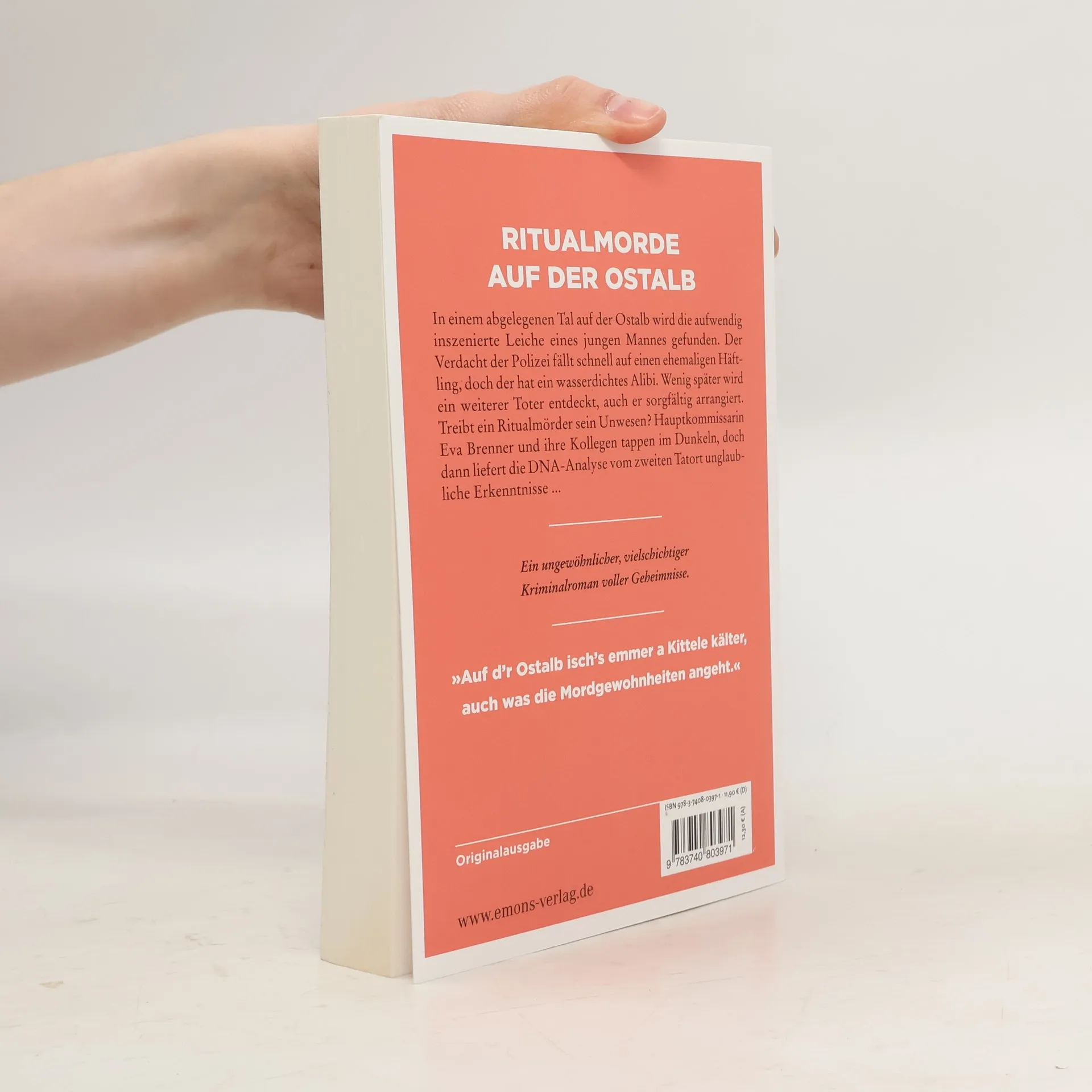 Ein ungewöhnlicher Krimi mit starken Frauenfiguren. In einem abgelegenen Tal auf der Ostalb wird die aufwendig inszenierte Leiche eines jungen Mannes gefunden. Der Verdacht der Polizei fällt schnell auf einen ehemaligen Häftling, doch der hat ein wasserdichtes Alibi. Wenig später wird ein weiterer Toter entdeckt, auch er sorgfältig arrangiert. Treibt ein Ritualmörder sein Unwesen? Hauptkommissarin Eva Brenner und ihre Kollegen tappen im Dunkeln, doch dann liefert die DNA-Analyse vom zweiten Tatort unglaubliche Erkenntnisse.