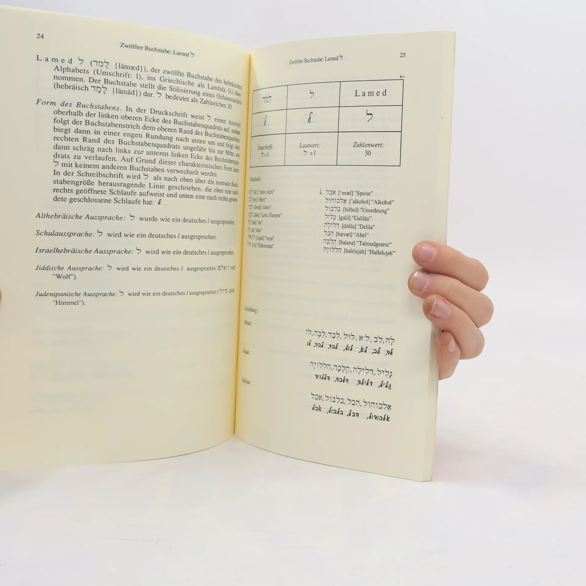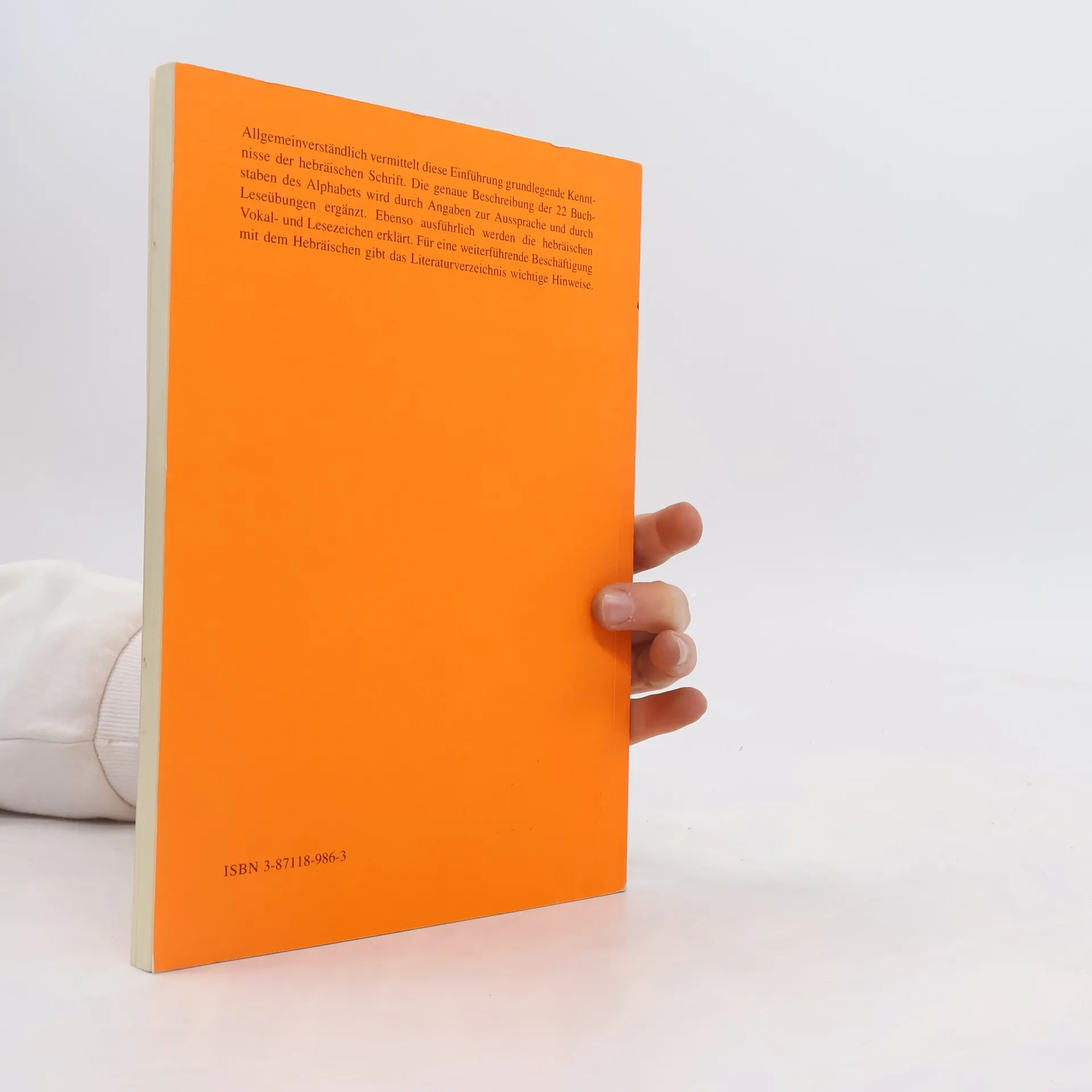 Zielgruppe: Interessierte ohne Vorkenntnisse; Israelreisende; Bibelleser; Germanisten und Romanisten, die sich mit jiddischen oder judenspanischen Texten beschäftigen. Lernziele: Die hebräische Schrift lesen und schreiben können. Konzeption: Einem kurzen Abriß über die Geschichte und Anwendung der hebräischen Schrift folgt die didaktische Darstellung der 22 Buchstaben des Alphabets, der Vokal- und Lesezeichen mit Anleitungen zur Schreibweise. Allgemeinverständlich formuliert werden diese Erläuterungen durch eine Reihe von Übungen ergänzt. Besonderer Wert wird auf die Form der Buchstaben und die Abgrenzung von ähnlich aussehenden gelegt, weil Anfänger hierbei oft Schwierigkeiten haben.