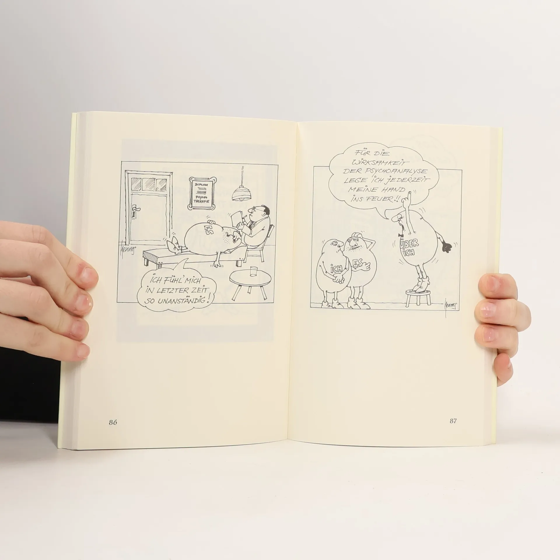 Cartoons über die Psychoanalyse? Hätte sich der große Sigmund Freud so ein scheinbar respektloses Buch über seine genialen Theorien erbost verbeten? Wohl kaum, denn schon in seiner Abhandlung über den Witz hatte Freud gezeigt, dass ihn dieses Genre durchaus faszinierte. An Humor fehlte es ihm also sicherlich nicht. Für den Cartoonisten Hans Biedermann, der selbst der Psychologen-Zunft angehört, ist das Thema unwiderstehlich: Die Darstellung der "Drillinge" ICH, ES und ÜBER-ICH als skurrile Comic-Figuren, die sich in allen möglichen Variationen ständig in den Haaren liegen, verschafft ihm ein händereibendes Vergnügen. Und er hofft, dass die Leser ähnlich viel Spaß daran haben werden. Kein Nachteil ist dabei gewiss, dass sich in diesem Opus nebenbei auch etwas über Entstehung, Theorie und Methodik der Psychoanalyse erfahren lässt. Schließlich bleiben Inhalte, die man sich mit einem Schmunzeln aneignet, erwiesenermaßen besser im Gedächtnis als andere, die man wie ein trockenes Brötchen hinunterwürgen muss. Dieses Buch versorgt aber nicht nur mit nützlichen Informationen über die Psychoanalyse, es trägt hoffentlich auch zur Erheiterung seiner Leserinnen und Leser bei! So sei es nun dem "Fachmann" wie dem "Laien" mit einem Augenzwinkern vorgelegt - und mit aller Hochachtung vor dem Werk des großen Doktor Freud.