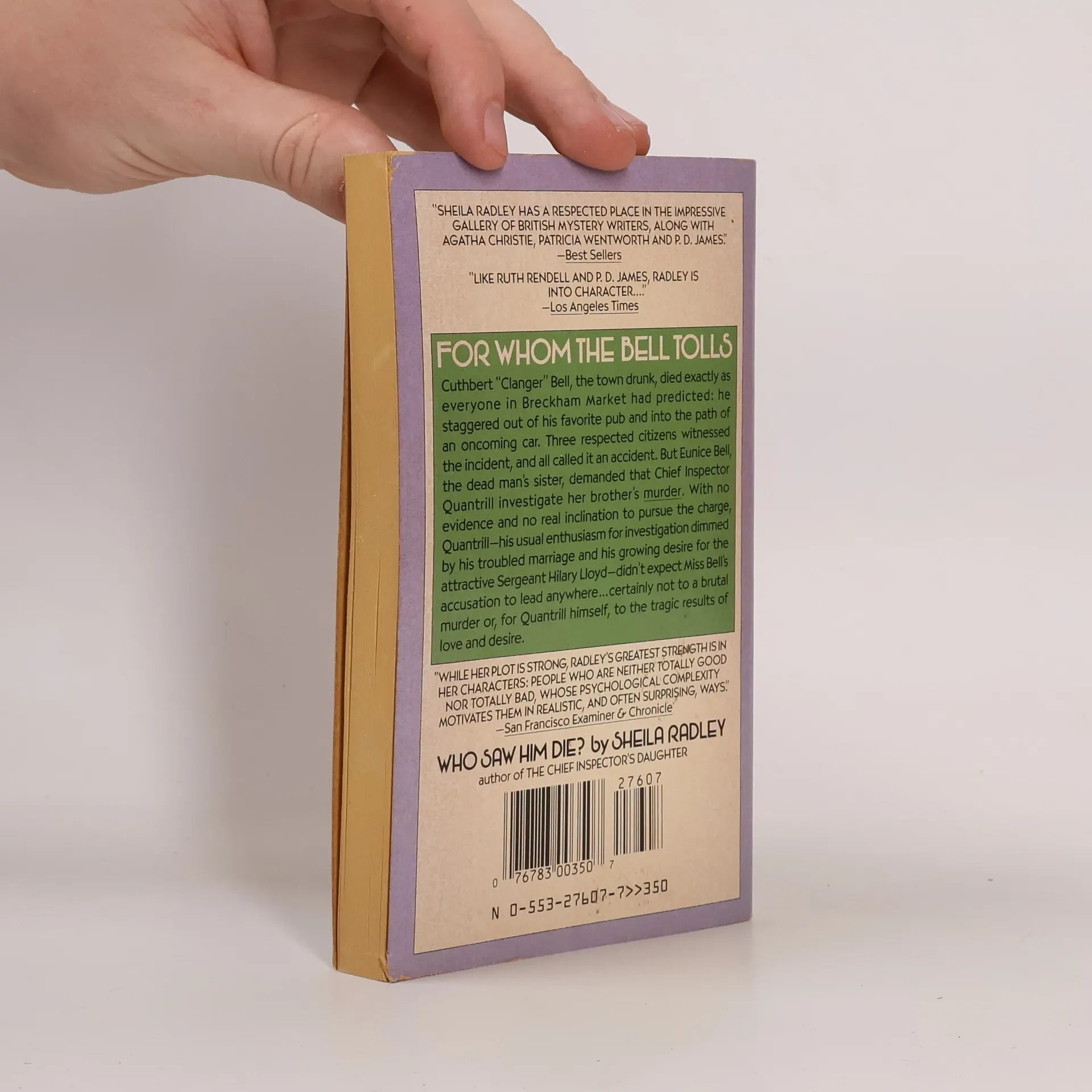 For whom the bell tolls. — Cuthbert "Clanger" Bell, the town drunk, died exactly as everyone in Breckham Market had predicted: he staggered out of his favorite pub and into the path of an oncoming car. Three respected citizens witnessed the incident, and all called it an accident. But Eunice Bell, the dead man's sister, demanded that Chief Inspector Quantrill investigate her brother's murder. With no evidence and no real inclination to pursue the charge, Quantrill -- his usual enthusiasm for investigation dimmed by his troubled marriage and his growing desire for the attractive Sergeant Hilary Lloyd -- didn't expect Miss Bell's accusation to lead anywhere... certainly not to a brutal murder or, for Quantrill himself, to the tragic results of love and desire.