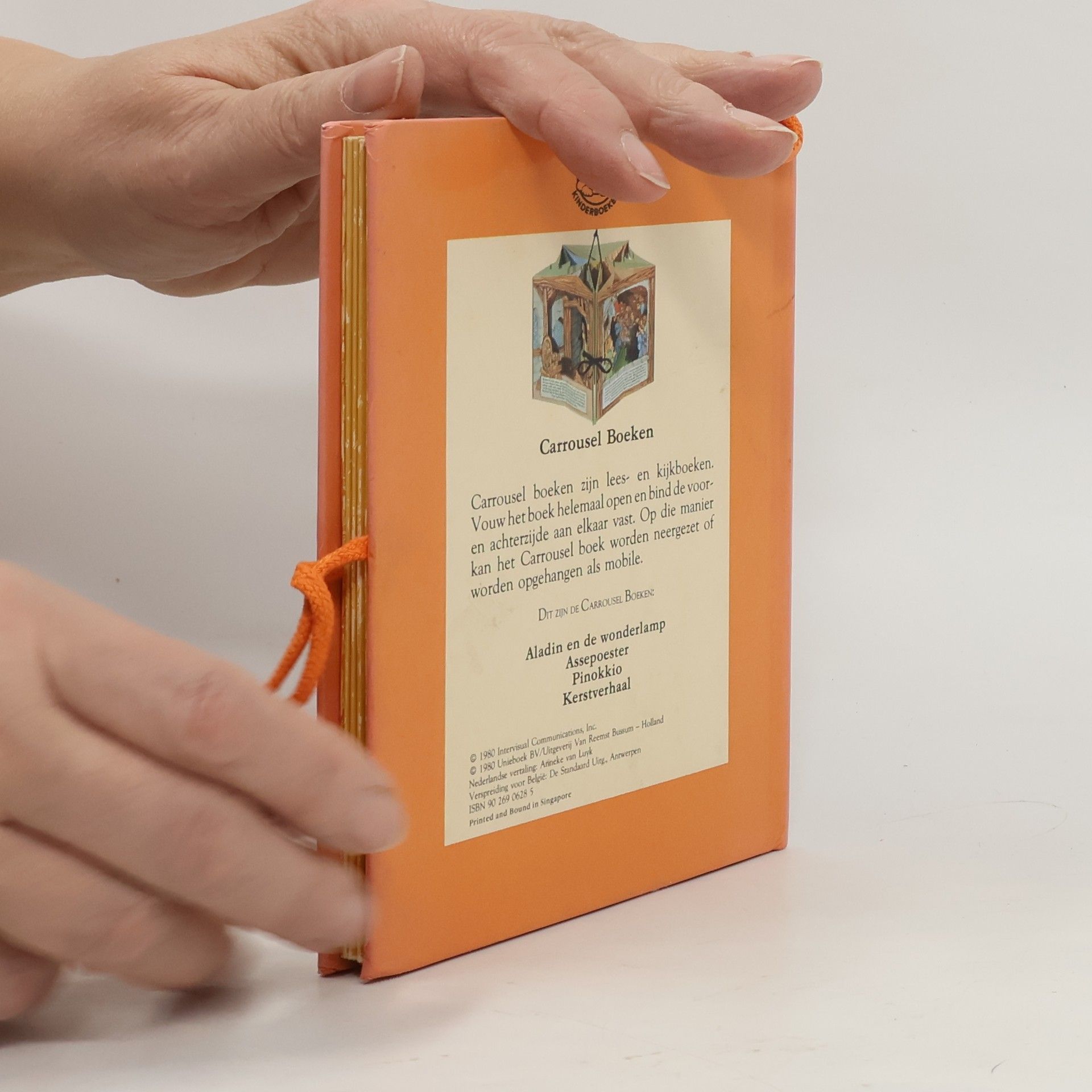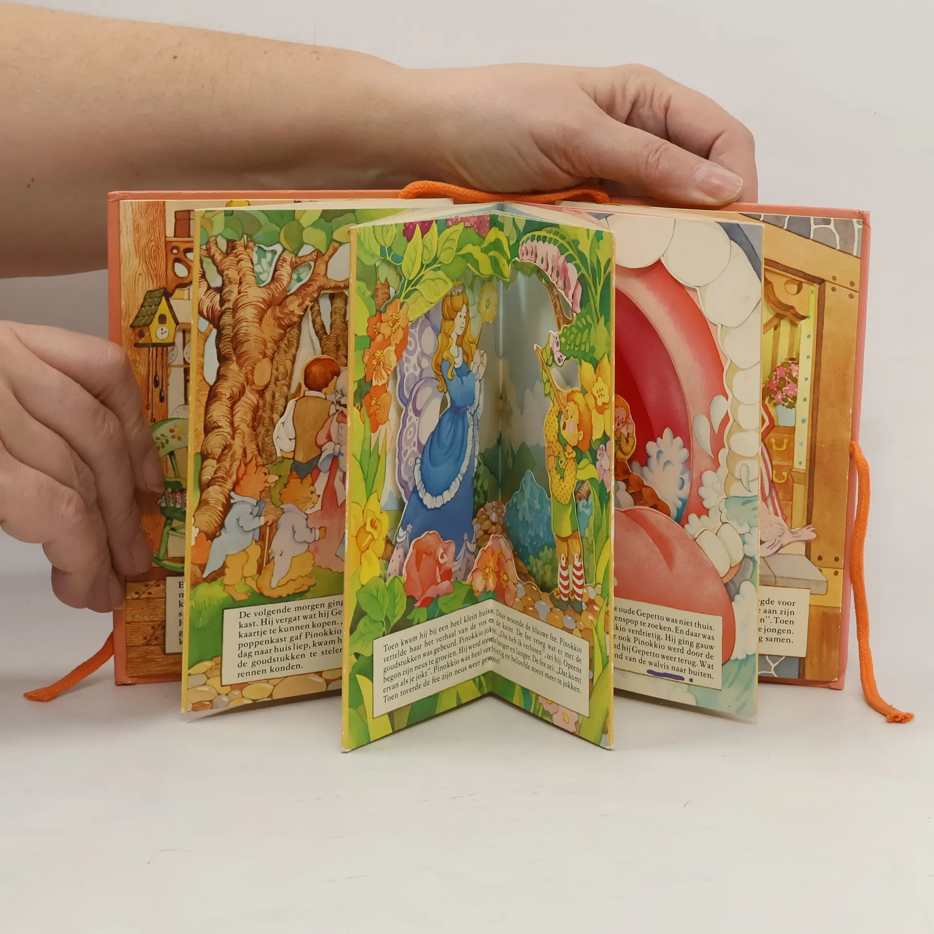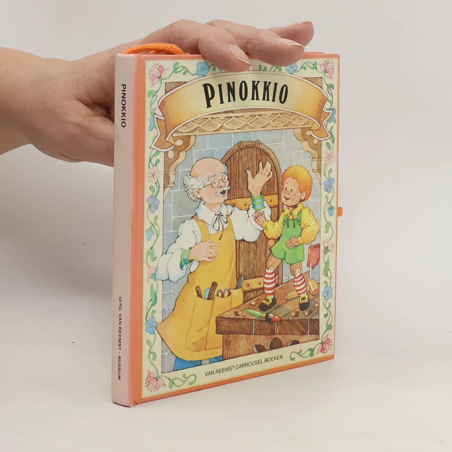 Als je de achterkant van dit boek aan de voorkant vastbindt, ontstaat er een caroussel waarin je het verhaal van Pinokkio kunt bekijken en lezen.