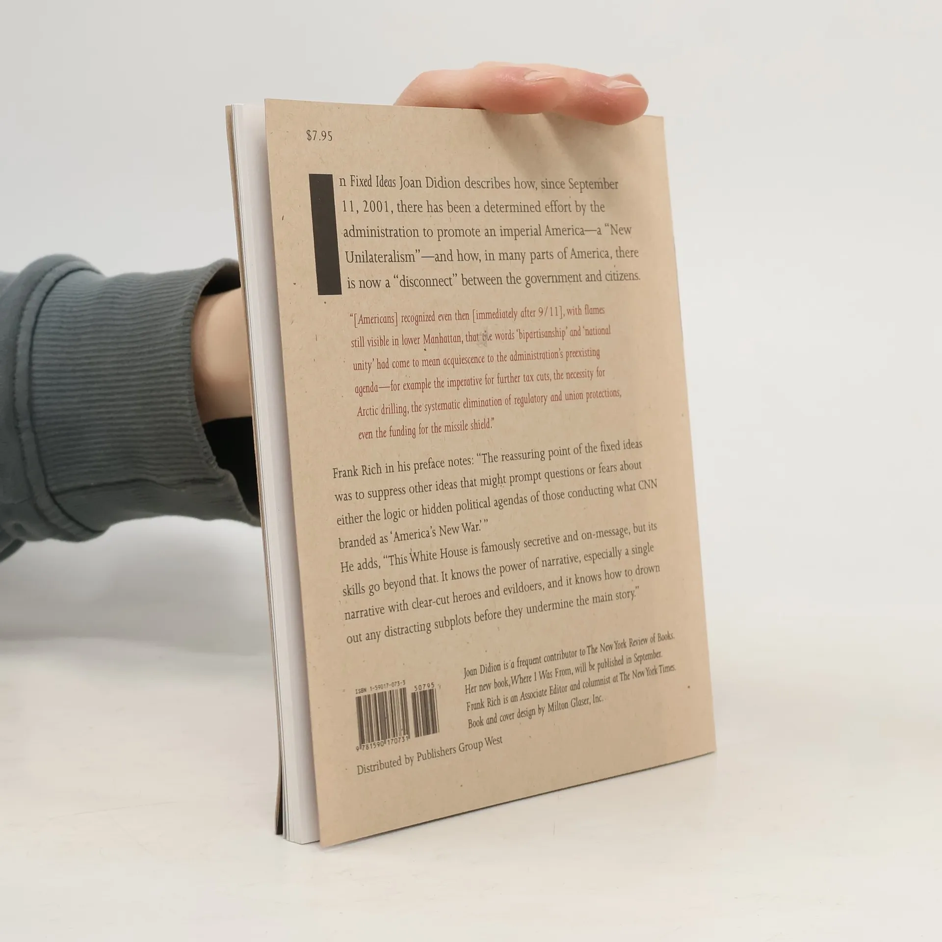 In Fixed Ideas Joan Didion describes how, since September 11, 2001, there has been a determined effort by the administration to promote an imperial America--a "New Unilateralism"--and how, in many parts of America, there is now a "disconnect" between the government and citizens."[Americans] recognized even then [immediately after 9/11], with flames still visible in lower Manhattan, that the words 'bipartisanship' and 'national unity' had come to mean acquiescence to the administration's preexisting agenda--for example the imperative for further tax cuts, the necessity for Arctic drilling, the systematic elimination of regulatory and union protections, even the funding for the missile shield."Frank Rich in his preface notes: "The reassuring point of the fixed ideas was to suppress other ideas that might prompt questions or fears about either the logic or hidden political agendas of those conducting what CNN branded as 'America's New War.'"He adds, "This White House is famously secretive and on-message, but its skills go beyond that. It knows the power of narrative, especially a single narrative with clear-cut heroes and evildoers, and it knows how to drown out any distracting subplots before they undermine the main story."Book and cover design by Milton Glaser, Inc.