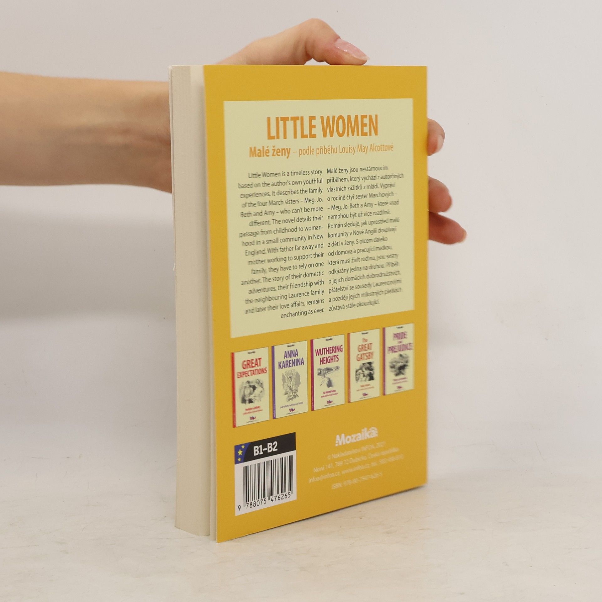 Malé ženy jsou nestárnoucím příběhem, který vychází z autorčiných vlastních zážitků z mládí. Vypráví o rodině čtyř sester Marchových, Meg, Jo, Beth a Amy, které snad nemohou být už více rozdílné. Román sleduje, jak uprostřed malé komunity v Nové Anglii dospívají z dětí v ženy. S otcem daleko od domova a pracující matkou, která musí živit rodinu, jsou sestry odkázány jedna na druhou. Příběh o jejich domácích dobrodružstvích, přátelství se sousedy Laurencovými a později jejich milostných pletkách zůstává stále okouzlující. Anglicko-český zrcadlový text pro mírně pokročilé Little Women is an ageless story based on the author's own experiences from her youth. It tells the story of a family of four March sisters, Meg, Jo, Beth and Amy, who perhaps can no longer be different. The novel follows the development of children from women into women in the middle of a small community in New England. With a father away from home and a working mother who has to support the family, the sisters depend on each other. The story of their home adventures, their friendship with Laurence's neighbors and later their love affairs still remains enchanting. English-Czech mirror text for intermediate students