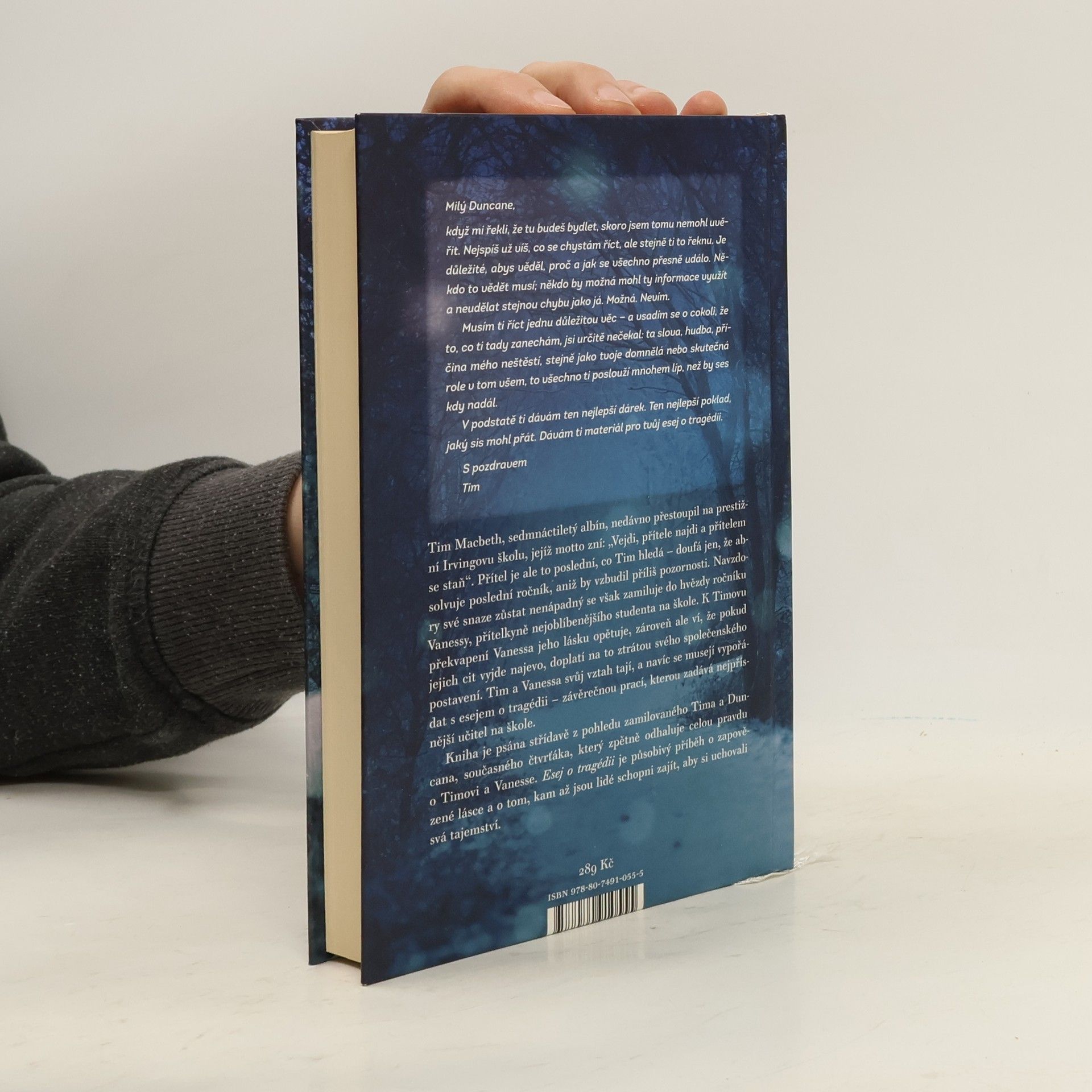 Pro fanoušky knih Proč? 13× proto a Hledání Aljašky. Tim Macbeth, sedmnáctiletý albín, nedávno přestoupil na prestižní Irvingovu školu, jejíž motto zní: „Vejdi, přítele najdi a přítelem se staň.“ Ale přítel je to poslední, co Tim hledá — doufá jen, že absolvuje poslední ročník, aniž by vzbudil příliš pozornosti. Ale navzdory své snaze zůstat nenápadný se zamiluje do hvězdy ročníku Vanessy, přítelkyně nejoblíbenějšího studenta na škole. K Timovu překvapení Vanessa jeho lásku opětuje, ale pokud by to někdo zjistil, mohlo by to otřást jejím společenským postavením. Tim a Vanessa navážou utajovaný vztah, ale navíc se musí vypořádat s esejem o tragédii, závěrečnou prací posledního ročníku, kterou zadává nejpřísnější učitel na škole. Kniha je psána střídavě z pohledu zamilovaného Tima a také Duncana, studenta posledního ročníku, který odhaluje celou pravdu o Timovi a Vanesse. Esej o tragédii je působivý příběh o zapovězené lásce a o tom, kam až jsou lidé schopni zajít, aby si uchovali svá tajemství.