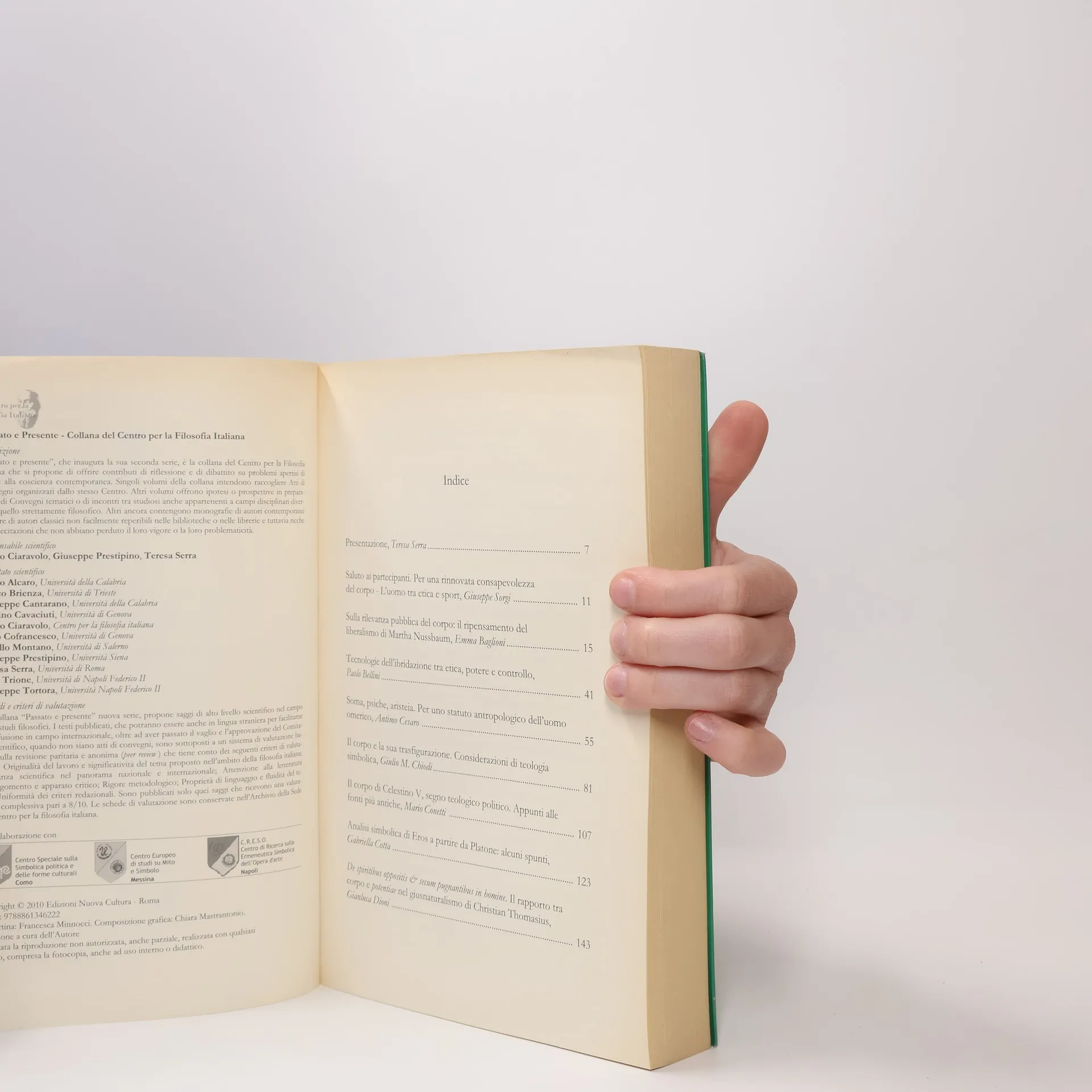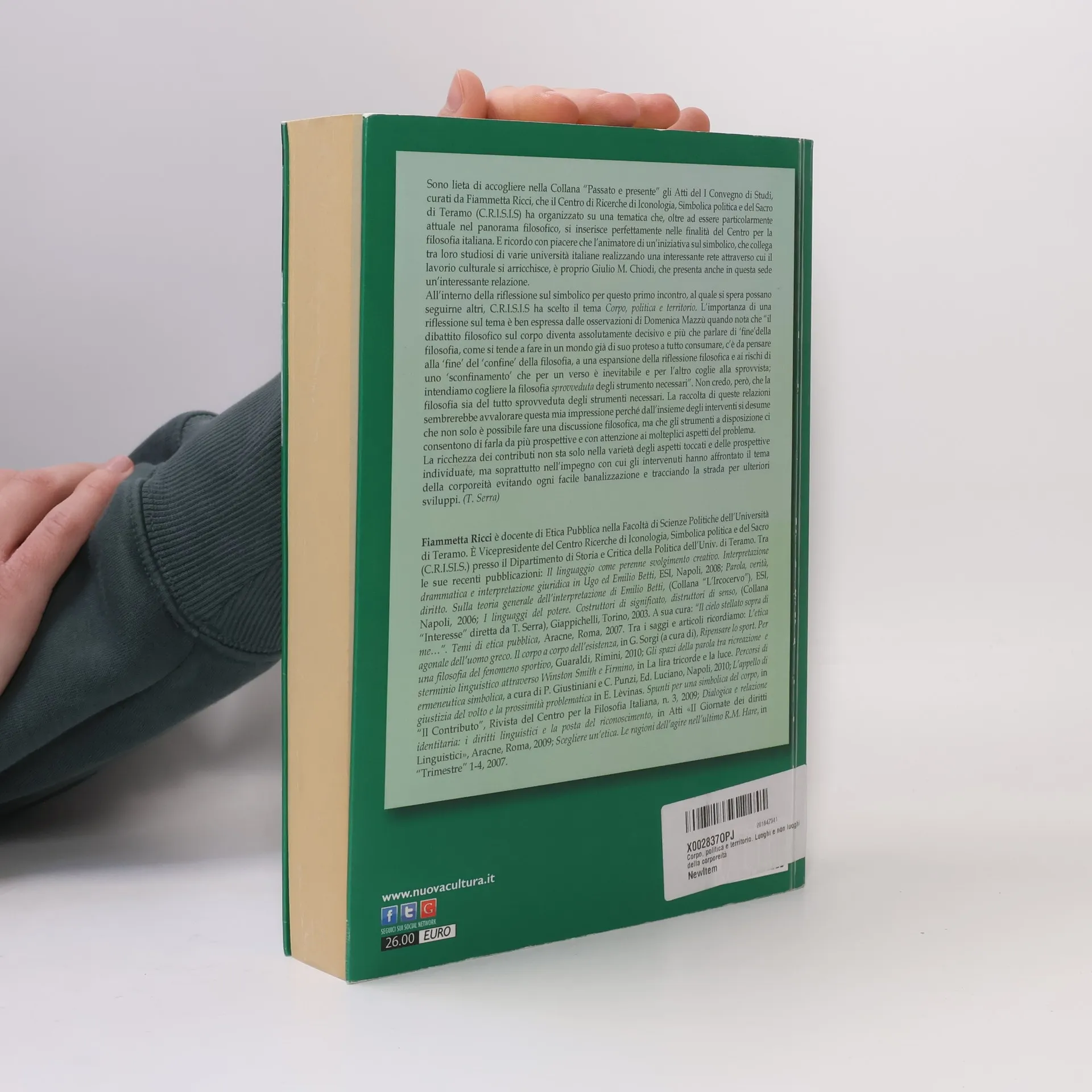 Sono lieta di accogliere nella Collana “Passato e presente” gli Atti del I Convegno di Studi, curati da Fiammetta Ricci, organizzato dal Centro di Ricerche di Iconologia, Simbolica politica e del Sacro di Teramo (C.R.I.S.I.S). Questo evento si inserisce perfettamente nelle finalità del Centro per la filosofia italiana e rappresenta un'importante iniziativa sul simbolico, animata da Giulio M. Chiodi, che ha creato una rete di studiosi di diverse università italiane. Il tema scelto per questo primo incontro è Corpo, politica e territorio, evidenziando l'importanza di riflessioni filosofiche sul corpo. Domenica Mazzù sottolinea che il dibattito filosofico sul corpo è cruciale, suggerendo di considerare non solo la “fine” della filosofia, ma anche l’espansione della sua riflessione. Nonostante le sfide, credo che la filosofia disponga di strumenti adeguati. Le relazioni raccolte dimostrano che è possibile affrontare discussioni filosofiche da molteplici prospettive, con attenzione ai vari aspetti del problema. La varietà e l'impegno degli interventi hanno evitato banalizzazioni, tracciando la strada per ulteriori sviluppi nel campo della corporeità. (T. Serra)