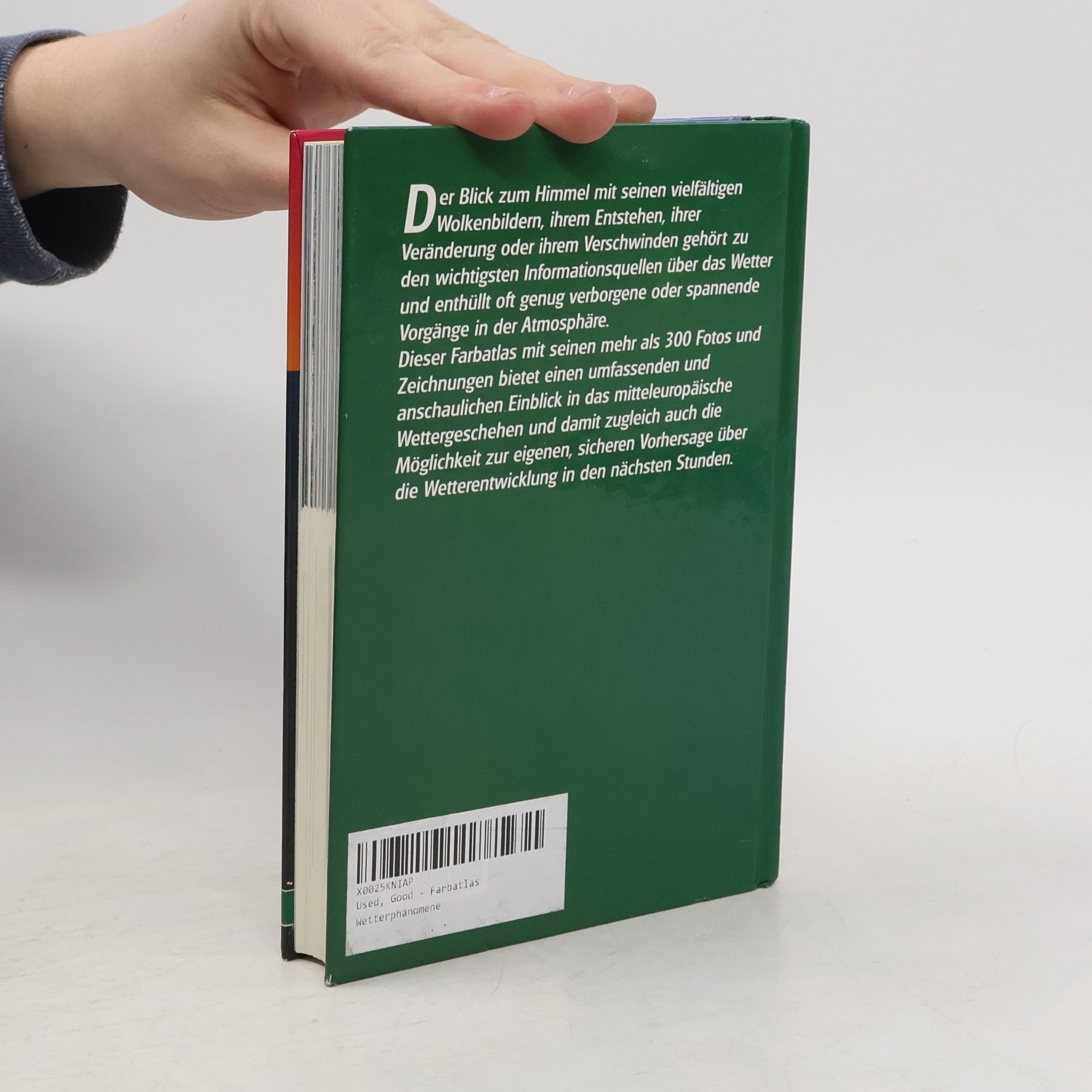 Ein Farbatlas für alle, die am Wetter interessiert sind, und ein hochinteressanter Begleiter durch die vielgestaltigen Formen meteorologischer Phänomene. Er stellt über 300 Wettererscheinungen in hochkarätigen farbigen Fotos vor und macht sie mit allgemein verständlichen Erklärungen, übersichtlichen Grafiken und Tabellen auch für Laien transparent. Sonnenstrahlung, atmosphärische Optik, Wärmestrahlung, Ausbreitung von Luftinhaltsstoffen, Föhn, Nebel, Regen, Schnee, Hagel, Gewitter, Eis, Kleinklima, Wind und Sturm bleiben kein Geheimnis mehr.
