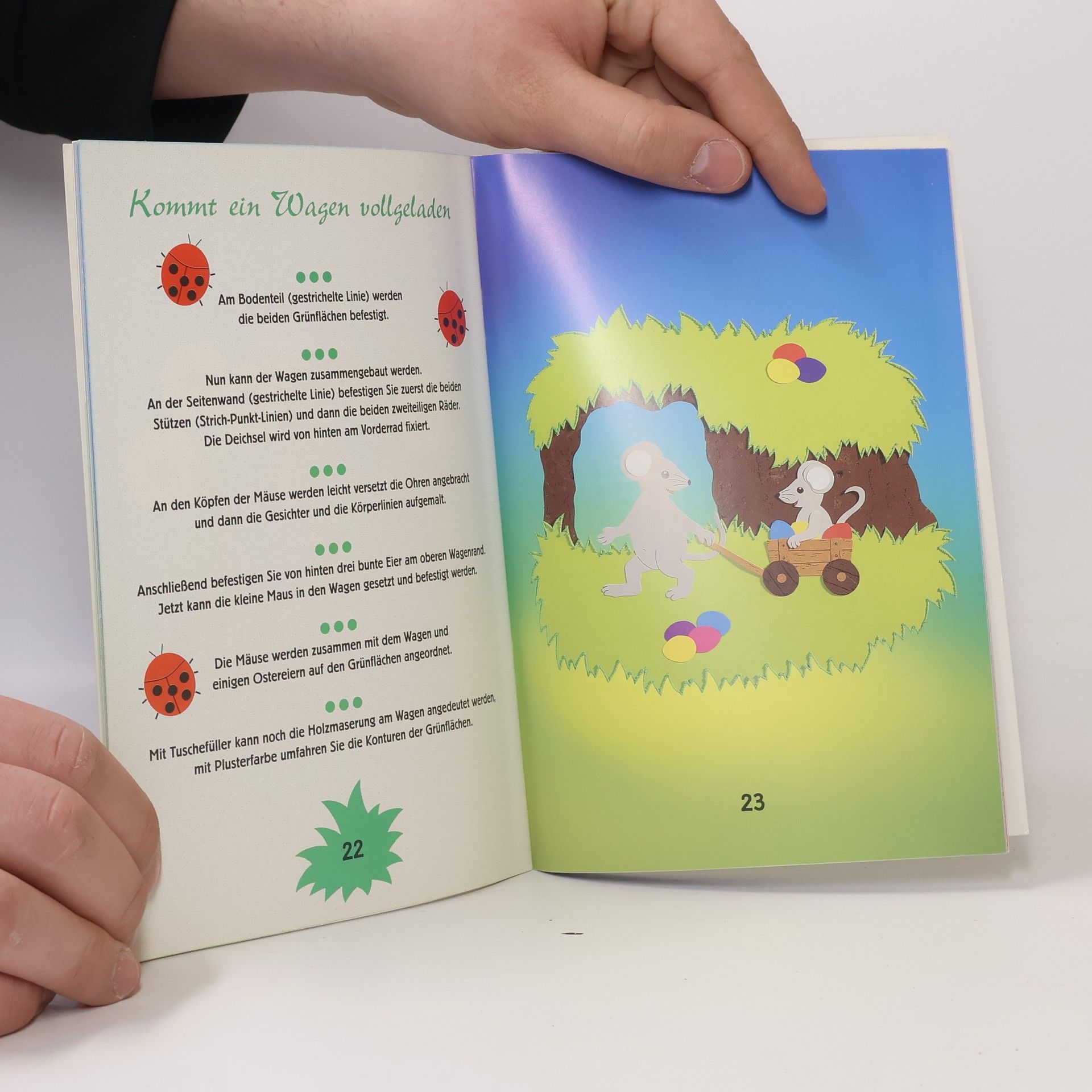 Bilder und Anleitungen zu sehr einfachen, problemlos nacharbeitbaren Motiven: Mäusekinder zwischen Frühlingsblumen, Ostereiern u.a.m