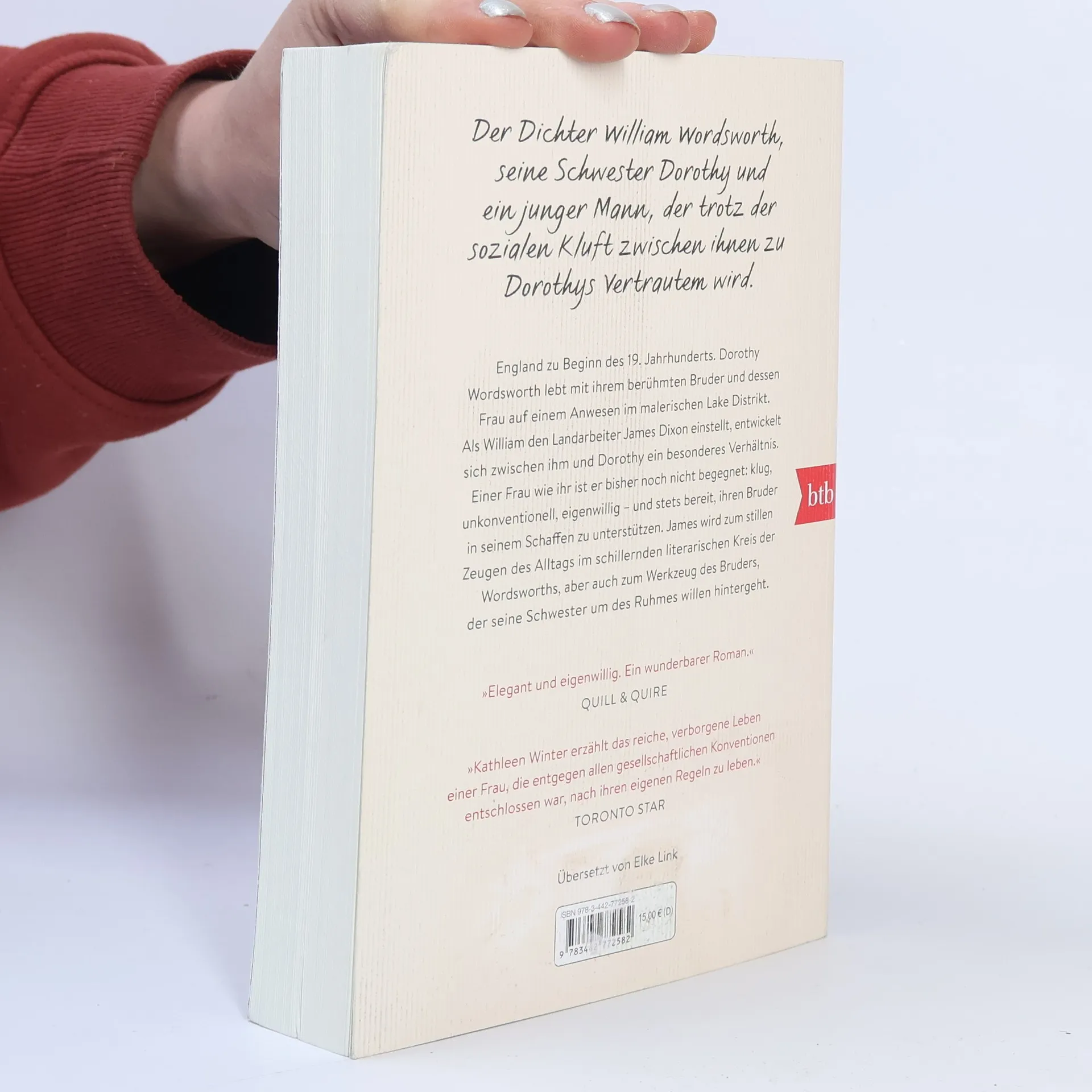 »Ein unkonventioneller Blick auf die ebenso unkonventionelle Dorothy Wordsworth, die Frau hinter ihrem berühmten Bruder William.« The Globe and Mail England zu Beginn des 19. Jahrhunderts. Dorothy Wordsworth, Anfang dreißig, hat bisher ein wildes und unkonventionelles Leben geführt. Und sie ist die Vertraute und kreative Unterstützerin ihres berühmten Bruders William – einige glauben sogar, sie sei das Geheimnis hinter dessen dichterischem Ruhm. Nun hat sie gemeinsam mit ihm und seiner Frau ein vermeintliches Idyll im malerischen Lake District geschaffen. Als William den jungen Landarbeiter James Dixon einstellt, entwickelt sich zwischen ihm und Dorothy – trotz der sozialen Kluft - ein besonderes Verhältnis. Einer Frau wie ihr ist er bisher noch nicht begegnet. Er wird zum stillen Zeugen des Alltags in Dorothys schillerndem literarischen Kreis, aber auch zum Werkzeug des Bruders, der seine Schwester hintergeht »Das weinrote Tagebuch« lässt uns eintauchen in eine Welt voller emotionaler und künstlerischer Kämpfe, von Triumphen und persönlichem Verrat – und beindruckender Natur. Vor allem aber in die Geschichte einer starken und ungewöhnlichen Frau, die allen Widrigkeiten zum Trotz entschlossen ist, nach ihren eigenen Regeln zu leben.