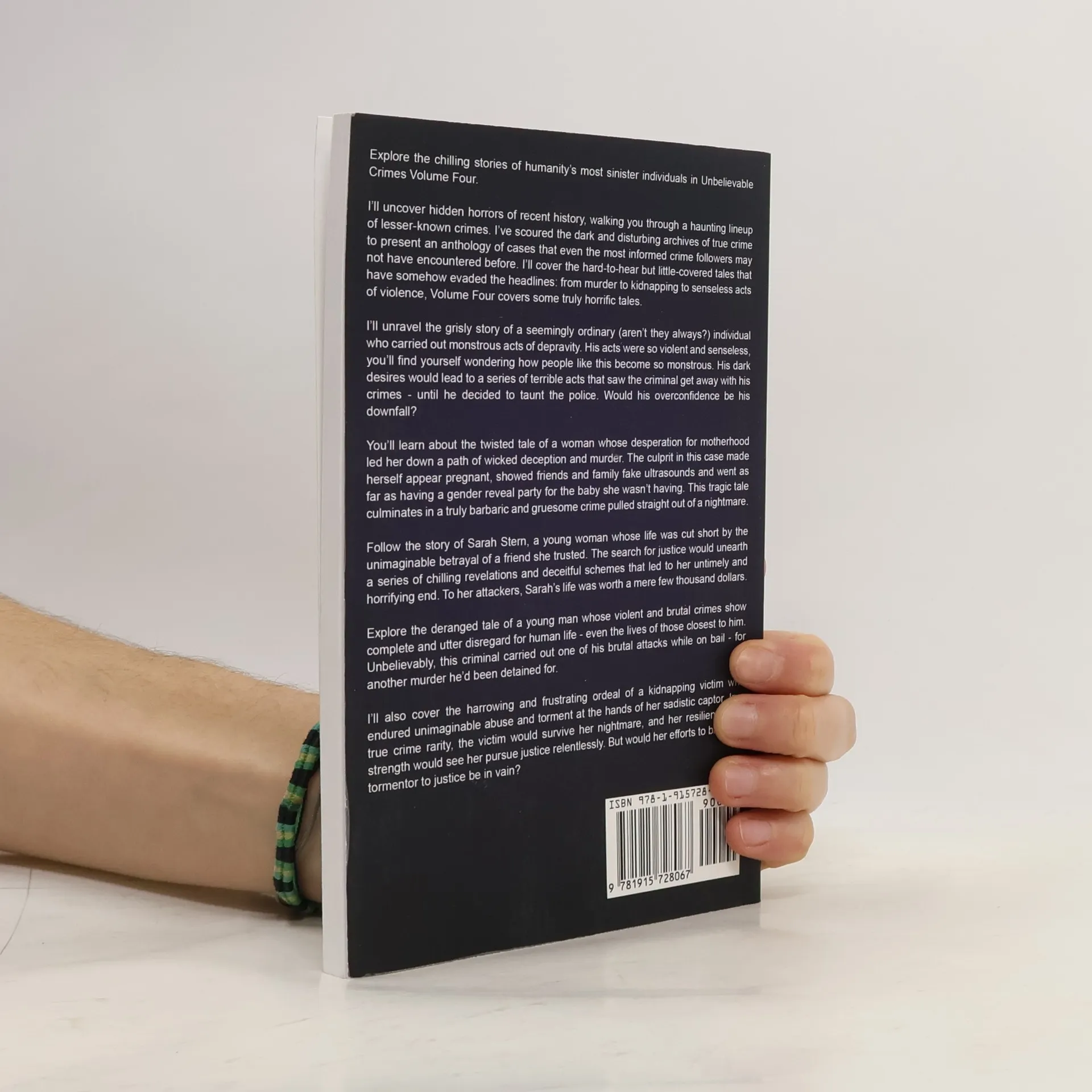 Explore the chilling stories of humanity's most sinister individuals in Unbelievable Crimes Volume Four. I'll uncover hidden horrors of recent history, walking you through a haunting lineup of lesser-known crimes. I've scoured the dark and disturbing archives of true crime to present an anthology of cases that even the most informed crime followers may not have encountered before. I'll cover the hard-to-hear but little-covered tales that have somehow evaded the headlines: from murder to kidnapping to senseless acts of violence, Volume Four covers some truly horrific tales. I'll unravel the grisly story of a seemingly ordinary (aren't they always?) individual who carried out monstrous acts of depravity. His acts were so violent and senseless, you'll find yourself wondering how people like this become so monstrous. His dark desires would lead to a series of terrible acts that saw the criminal get away with his crimes - until he decided to taunt the police. Would his overconfidence be his downfall? You'll learn about the twisted tale of a woman whose desperation for motherhood led her down a path of wicked deception and murder. The culprit in this case made herself appear pregnant, showed friends and family fake ultrasounds and went as far as having a gender reveal party for the baby she wasn't having. This tragic tale culminates in a truly barbaric and gruesome crime pulled straight out of a nightmare. Follow the story of Sarah Stern, a young woman whose life was cut short by the unimaginable betrayal of a friend she trusted. The search for justice would unearth a series of chilling revelations and deceitful schemes that led to her untimely and horrifying end. To her attackers, Sarah's life was worth a mere few thousand dollars. Explore the deranged tale of a young man whose violent and brutal crimes show complete and utter disregard for human life - even the lives of those closest to him. Unbelievably, this criminal carried out one of his brutal attacks while on bail - for another murder he'd been detained for. I'll also cover the harrowing and frustrating ordeal of a kidnapping victim who endured unimaginable abuse and torment at the hands of her sadistic captor. In a true crime rarity, the victim would survive her nightmare, and her resilience and strength would see her pursue justice relentlessly. But would her efforts to bring her tormentor to justice be in vain? Get to know these chilling cases along with other lesser-known crimes in Unbelievable Crimes Volume Four. As with each book in this series, I delve deep into the darkest areas of humanity, recounting real-life cases of murder, violence, and unspeakable cruelty humans have carried out on one another. Keep this in mind before immersing yourself in these stories.