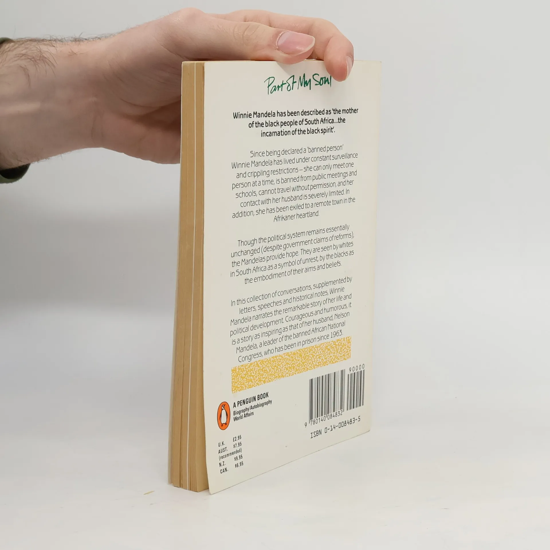 Winnie Mandela, one of So. Africa's most visible & articulate apartheid foes, spent many years as a banned person in her own country. She lived under virtual house arrest & was forbidden to address public gatherings or meet with more than one person at a time. She endured a forced separation of 27 years from her husband, Nelson Mandela. Here, in interviews & letters, she tells the story of her life & political development. A Tribute to Nomzamo Winnie Mandela/Bishop Manas Buthelezi My Little Siberia: Banished to Brandfort When My Father Taught Me History I Began to Understand: Growing up in the Countryside (Pondoland) Life with Him was Always a Life without Him: Meeting Nelson Mandela I Always Waited for that Sacred Knock: Life Underground He was a Pillar of Strength to Me: Being Alone No Human Being Can Go On Taking those Humiliations without Reaction: In Prison We Couldn't Stop Our Children: The Soweto Uprising, 1976 The Chapter of Dialogue is Finally Closed: The Political Situation Part of My Soul Went with Him: Visits to Robben Island & Pollsmoor Freedom Charter Winnie Mandela's Banning Order Conditions of Visit to Nelson Mandela on Robben Island Conditions with which Winnie Mandela Had to Comply to Travel from Brandfort to Robben Island & Back