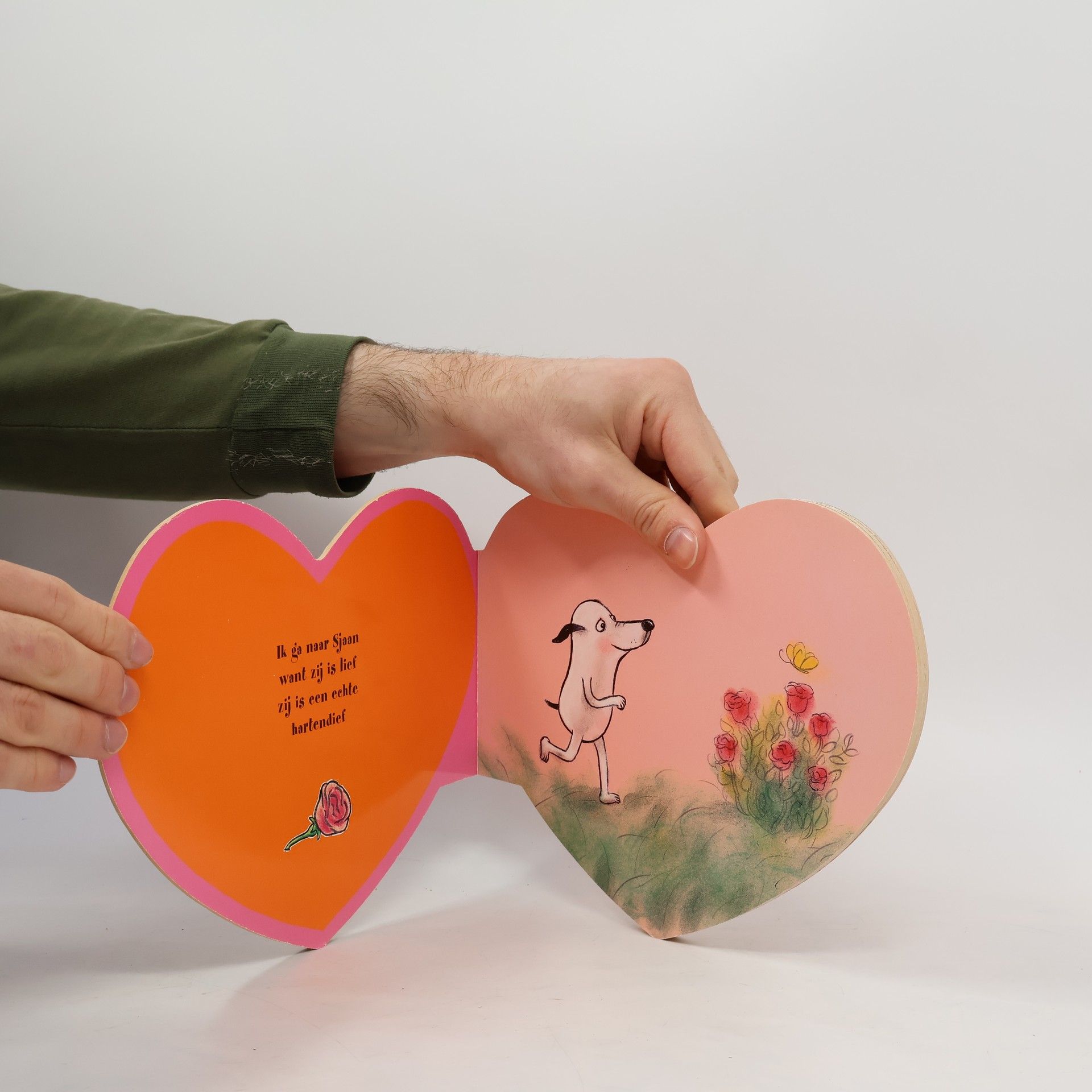 Hartvormig, hardkartonnen prentenboekje over het verliefde hondje Sjonnie dat een rode roos plukt en daarmee zijn liefde gaat betuigen aan zijn vriendinnetje Sjaantje. Hartvormig, hardkartonnen prentenboek met eenvoudige tekeningen in kleur en tekst op rijm. Vanaf ca. 3 jaar.